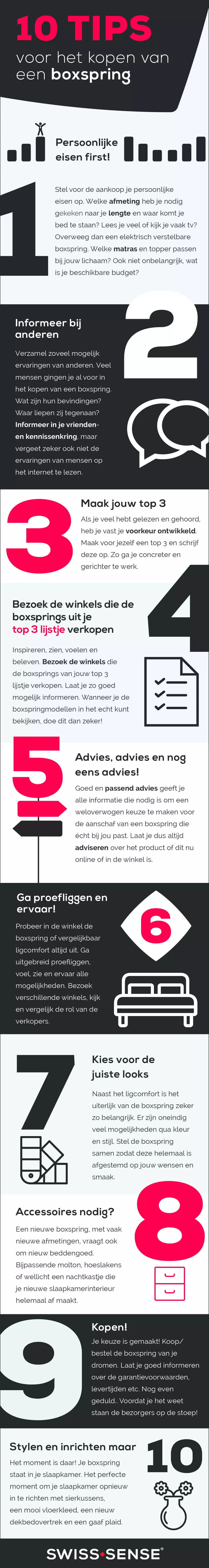 Je besteedt een derde van je leven op bed. Het is daarom belangrijk dat je bed - of in dit geval je boxspring - perfect bij jouw wensen en behoeften past. Maar hoe vind je een boxspring die bij je past? Om deze opgave makkelijker en overzichtelijker te maken hebben wij 10 tips aan de hand van stappen voor je gemaakt. Zo wordt een boxspring kopen een stuk eenvoudiger en slaap jij straks op de boxspring die helemaal bij jou past!