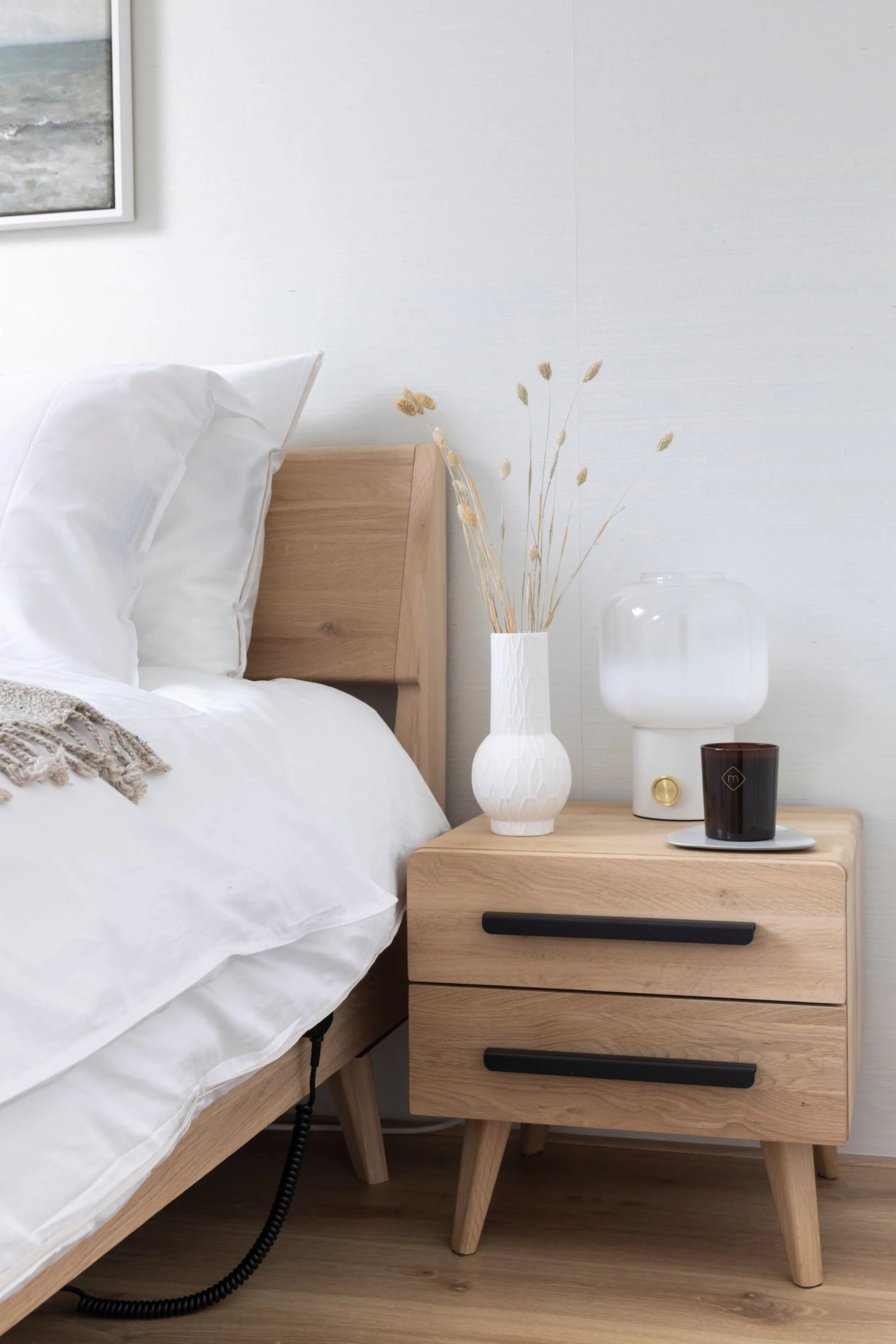 De nachtkastjes komen uit dezelfde serie van het bed, dit zorgt voor eenheid. De handgrepen zijn zwart metaal voor een subtiele robuuste uitstraling en de lades hebben een soft-closing systeem.