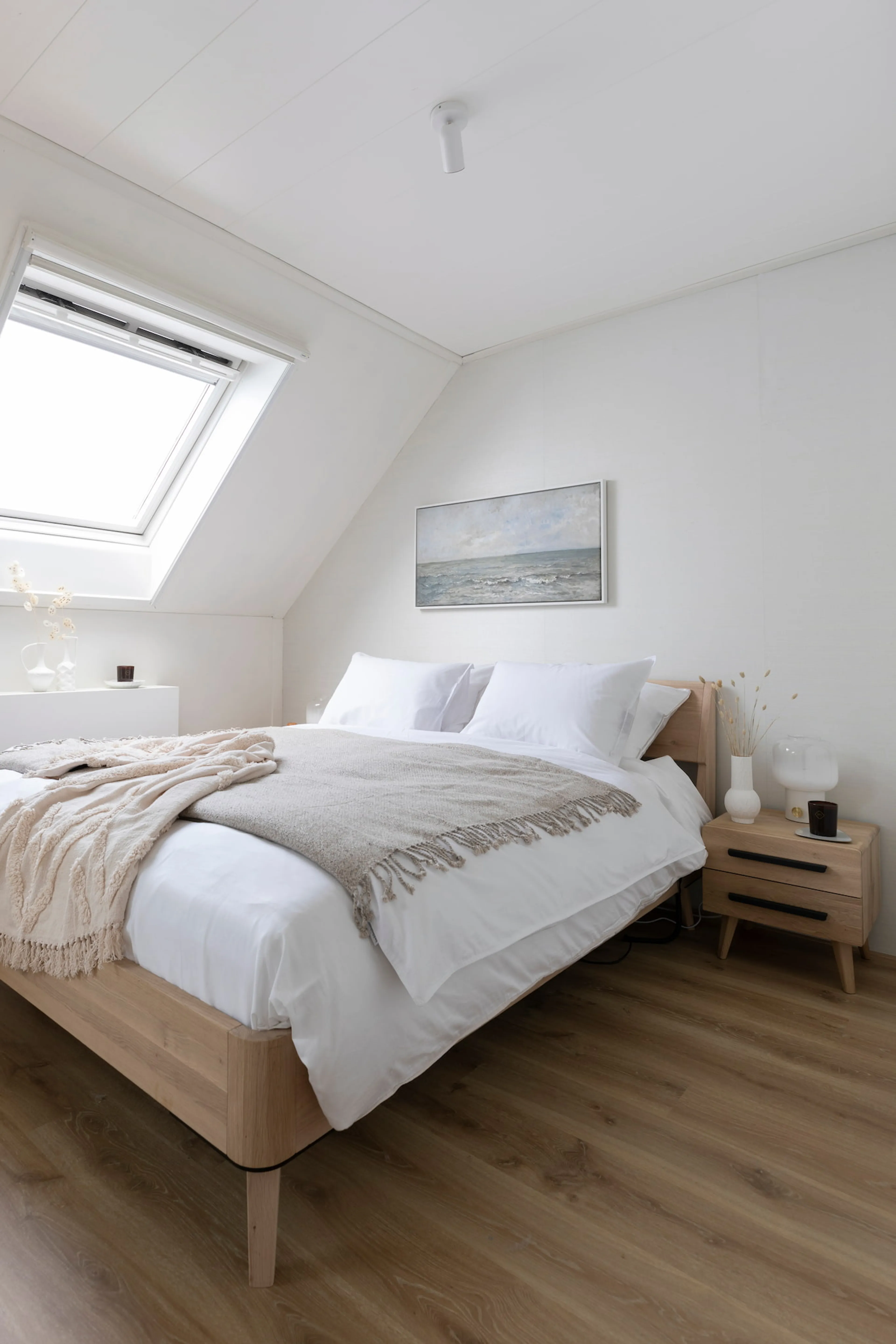 Een bepalend onderdeel van de slaapkamer is het bed. In deze slaapkamer is gekozen voor Bedframe Balance Tender uit de collectie van Swiss Sense. Het is een onbehandeld massief eikenhouten frame met afgeronde hoeken, voor een moderne sfeer. Het frame, het hoofdbord en de taps toelopende pootjes bestaan uit eikenhout. Door licht en onbehandeld hout te gebruiken, zorg je voor een warme en neutrale basis. Wil je gaan voor bijvoorbeeld meer contrast, dan kun je de kleur en afwerking van het hout aanpassen. Ook de hoogte van de bedzijdes kun je zelf samenstellen. Het bedframe wordt compleet gemaakt met twee elektrisch verstelbare bedbodems en twee losse matrassen voor luxe en comfort.