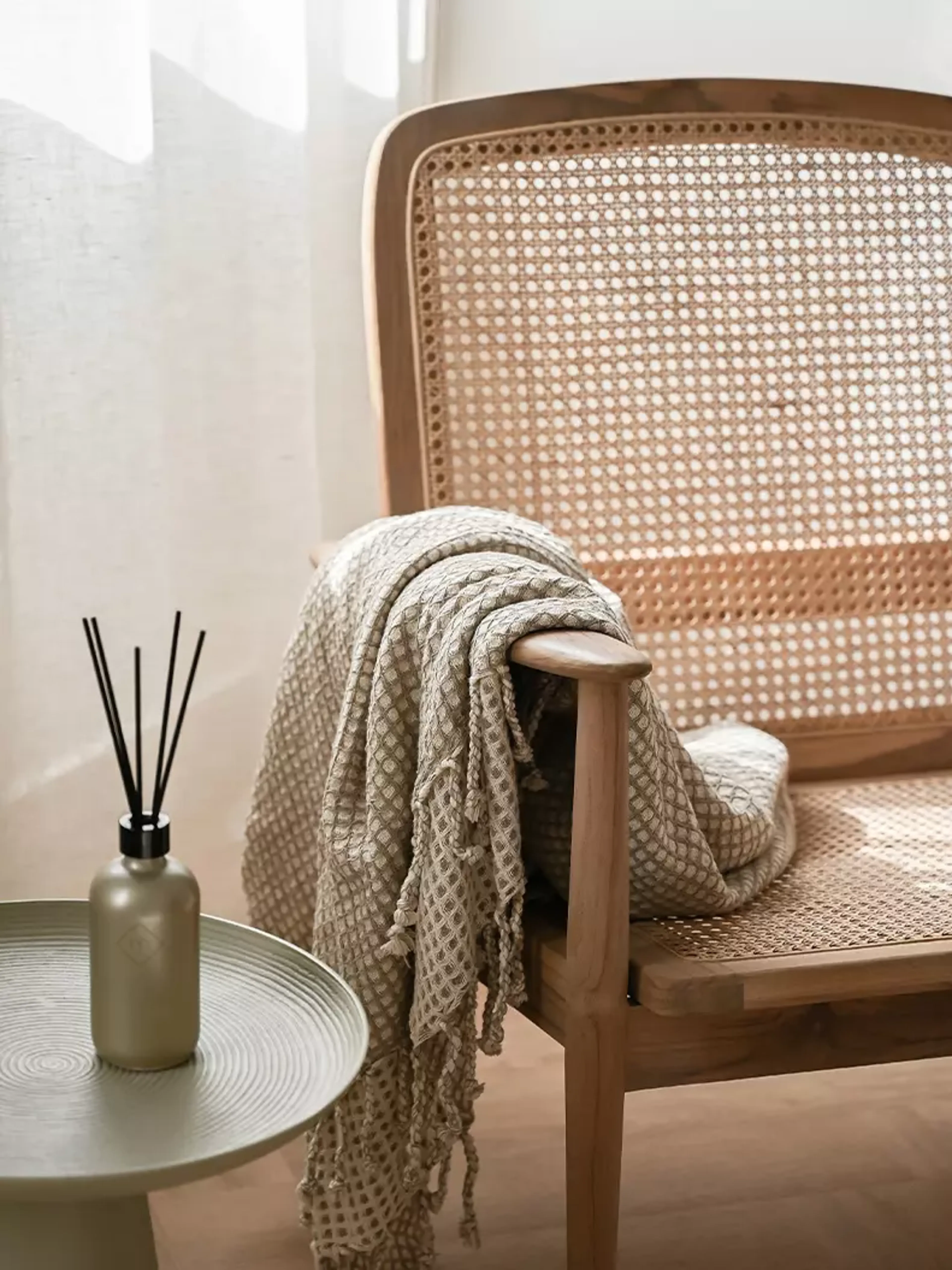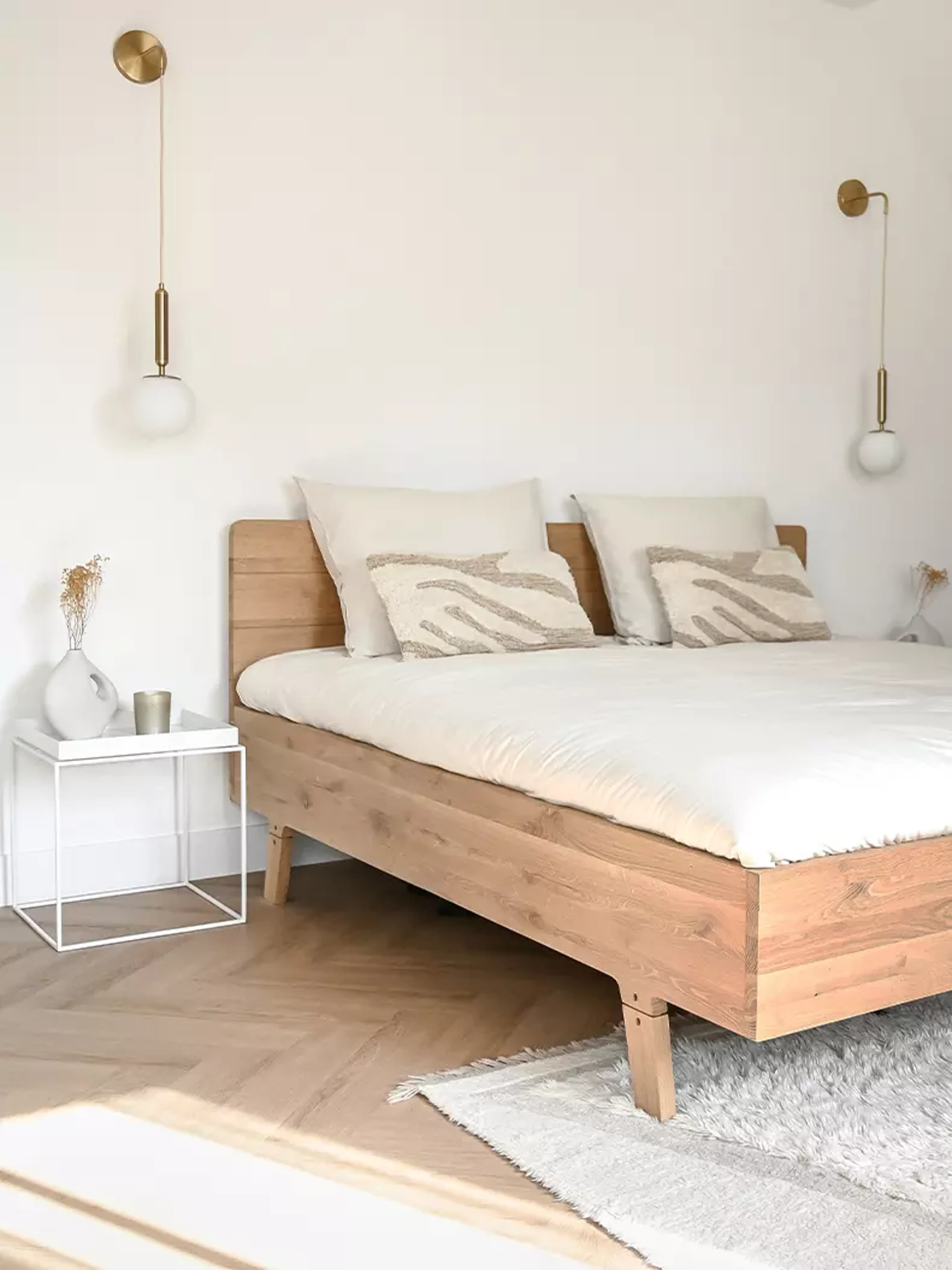 De slaapkamer is extra ruimtelijk door het hoge plafond dat wordt geaccentueerd door houten balken. Deze balken, die uit Friesland werden gehaald, zorgen ervoor dat het strakke gevoel van dit nieuwbouw huis doorbroken wordt met natuurlijke materialen. Het gebruik van natuurlijke materialen zie je ook terug in het houten bedframe. De lichte stoffen met zachte structuur, zoals de linnenlook van het dekbedovertrek en de bouclé-stof in de sierkussens benadrukken deze warme sfeer.