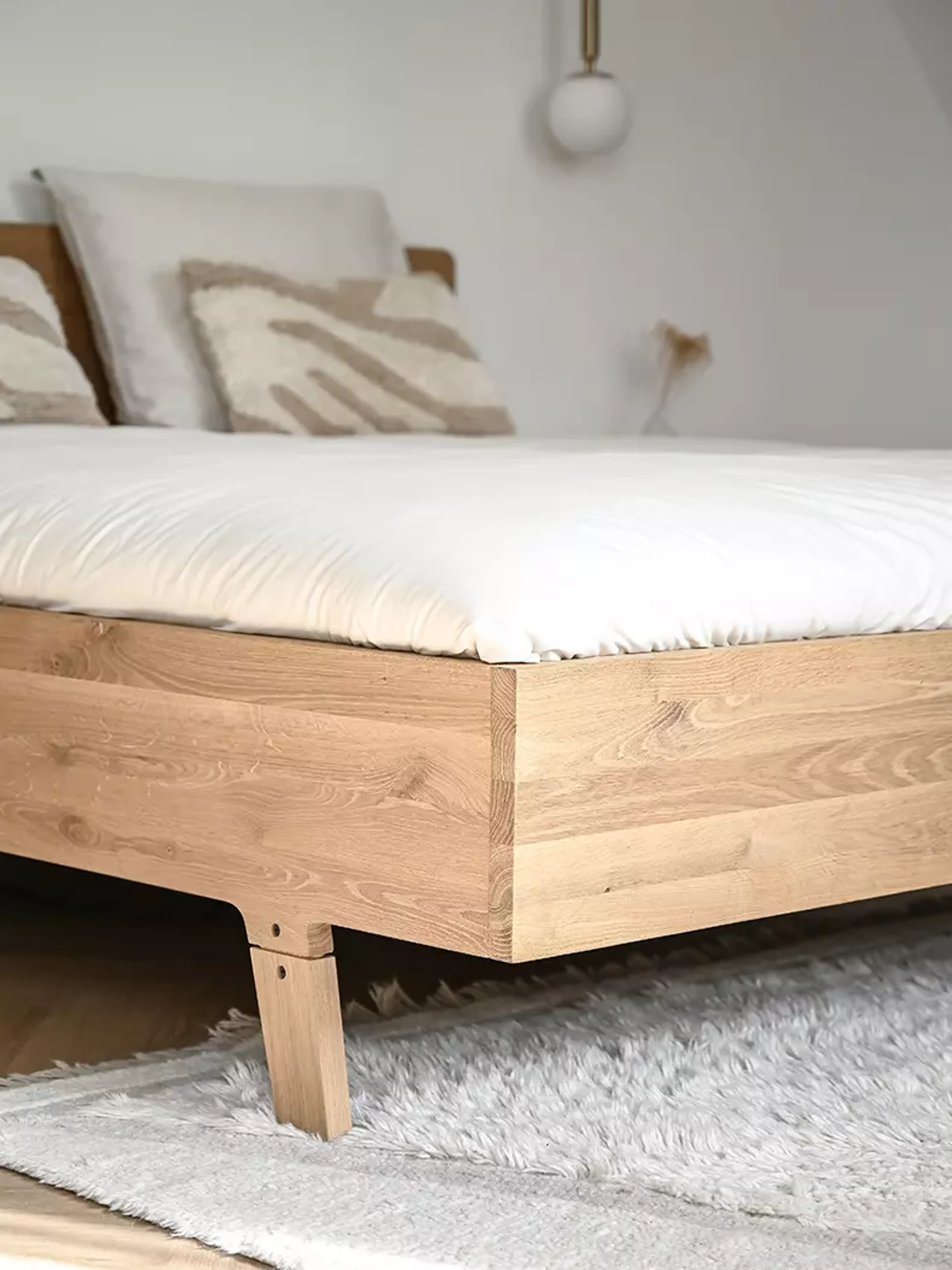 Ze was specifiek op zoek naar een bed met een houten frame en hoofdbord. Ook een elektrisch verstelbare bedbodem was een vereiste bij het uitkiezen van het bed. “We maken hier veel gebruik van en het was ideaal dat ik ons bed kon verstellen tijdens het voeden toen Mozi nog een baby was.” Voor de keuze van het matras heeft ze de online matraswijzer gebruikt. “Dat werkte voor mij super. Ik heb het bed via de webshop van Swiss Sense samengesteld en besteld en ben heel tevreden met de keuzes die ik gemaakt heb. Dit bed was precies wat ik in mijn hoofd had.”