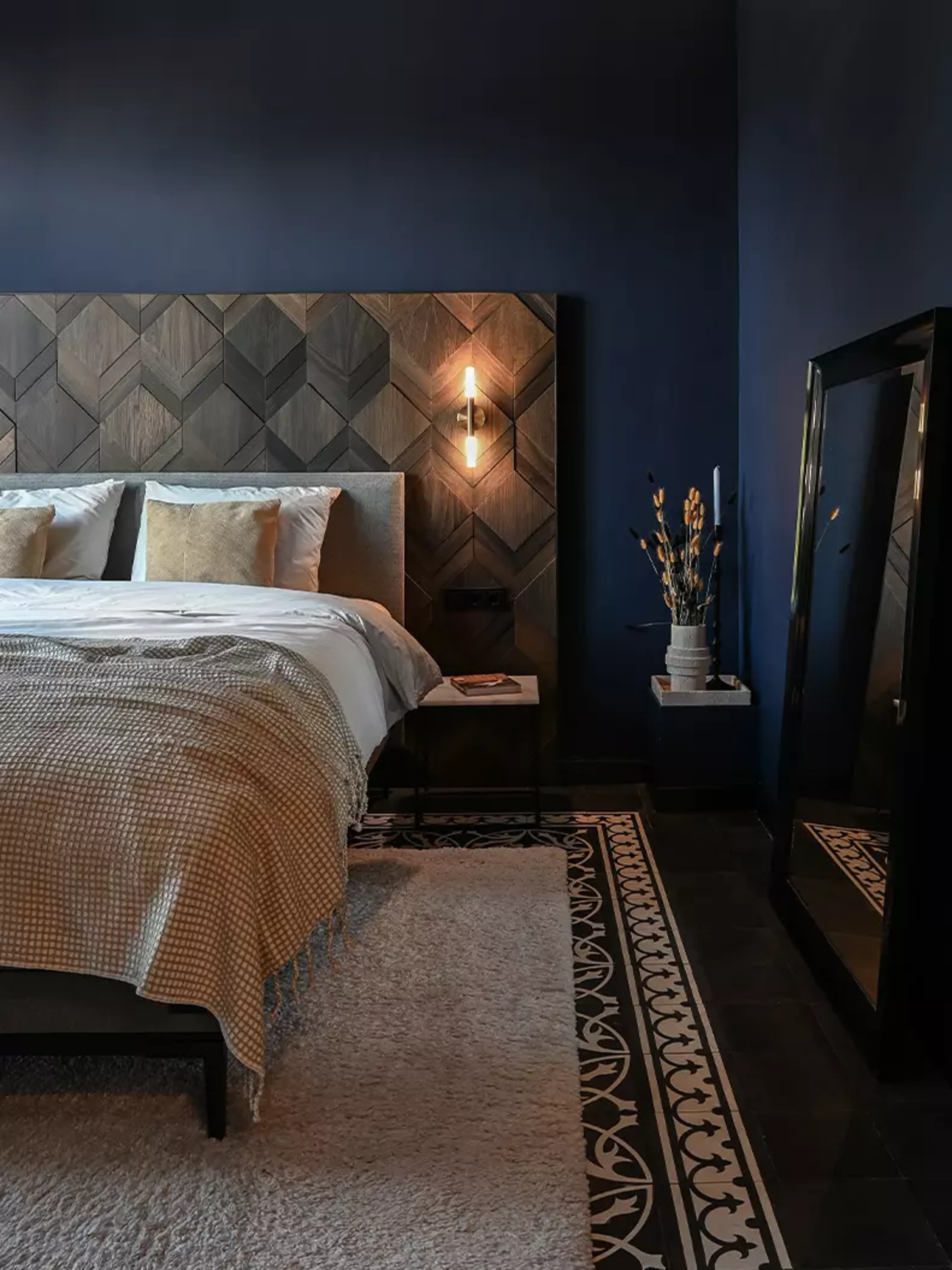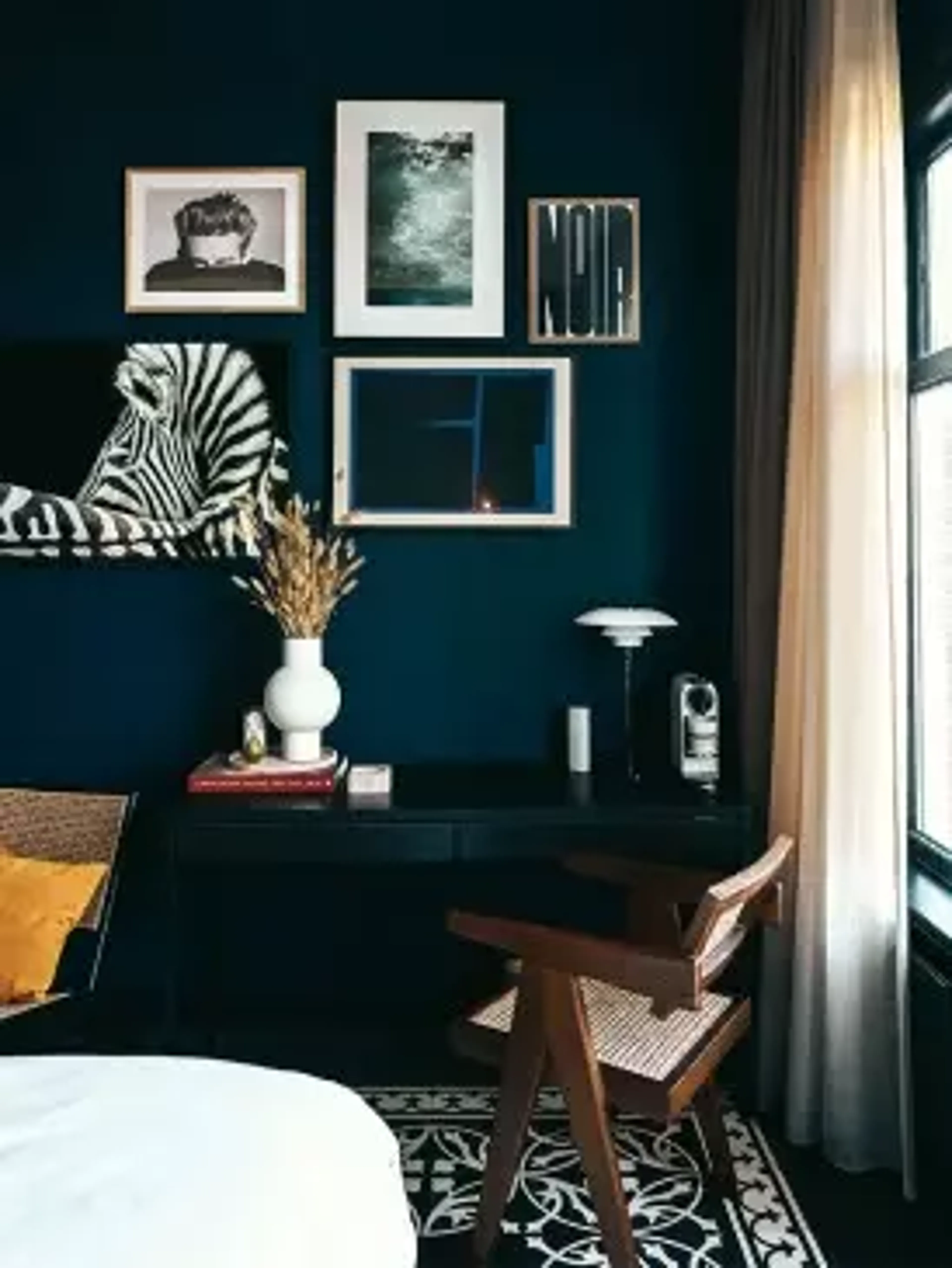 Bij het inrichten van hun slaapkamer vormden de authentieke openslaande deuren en tegelvloer met opvallend patroon het uitgangspunt. “Niet veel mensen hebben een tegelvloer in de slaapkamer, maar we vonden het te mooi om het te vervangen. Wel kozen we voor een vloerkleed om de slaapkamer net wat meer warmte te geven.” De authentieke stijl combineerden ze moeiteloos met een, zoals ze het zelf noemen, “midcentury en funky Scandinavische” inrichting.
