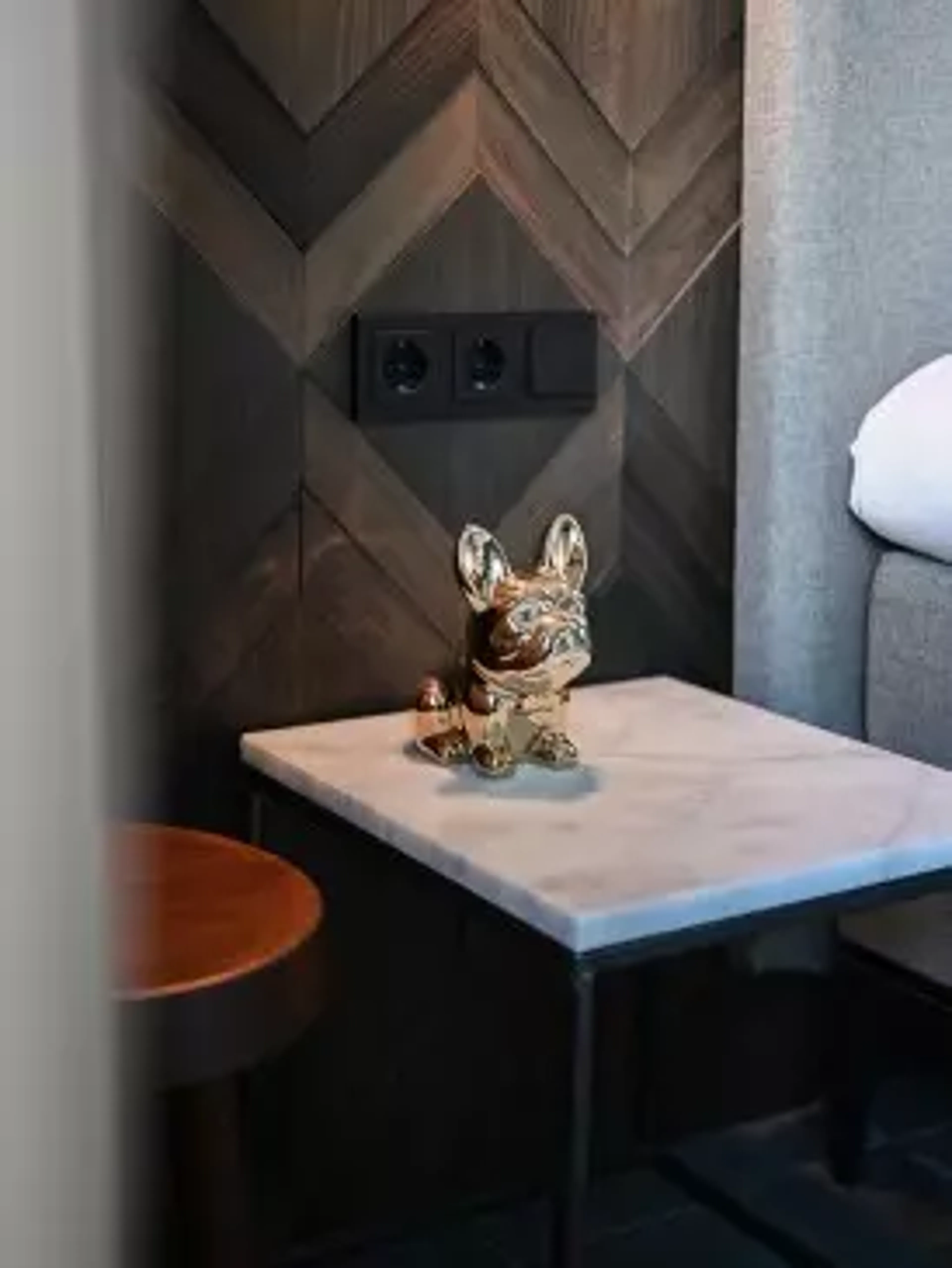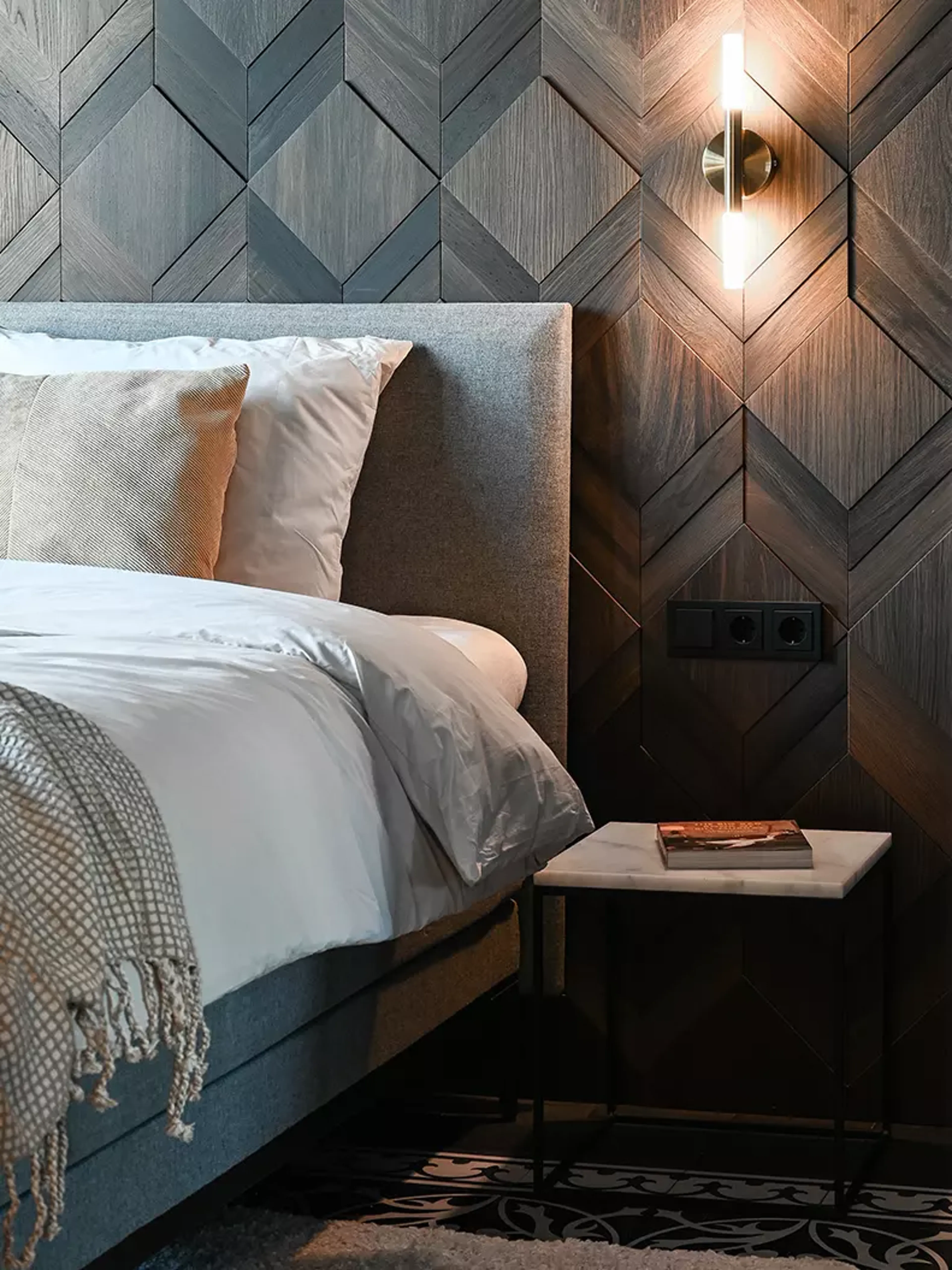 Dat resulteert in een slaapkamer die echt bij ze past. “John kan niet zonder een kop koffie in de ochtend. Om die reden staat er ook een koffiezetapparaat op de slaapkamer.” Samen met het houten paneel dat achter het bed schittert, geeft dat de uitstraling van een echte hotelkamer. Dat combineren Derkan en John moeiteloos met persoonlijke accessoires, waaronder nachttafels met marmer. Want als eigenaren van een merk in marmeren woonaccessoires mag dat natuurlijk niet ontbreken.