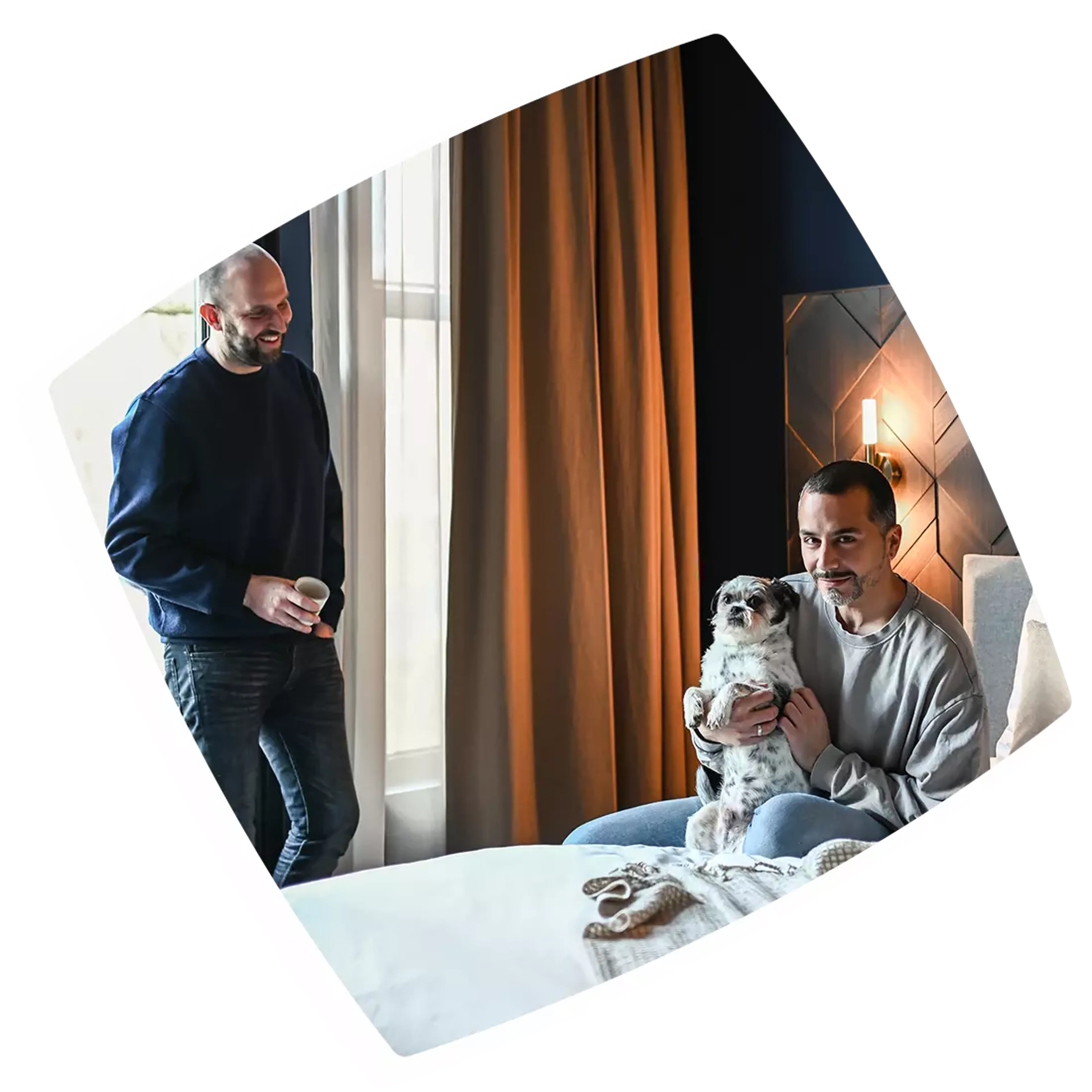 Wonen in: een herenhuis uit 1902 in BussumWonen met: hond TarkanHouden van: interieur, design en filmsDromen van: een groots en gelukkig levenSlapen op: Boxspring Lifestyle by vtwonen ThymeTe volgen via: @gooisemannenIn 2021 verlieten Derkan, John en hond Tarkan hun woning in Amsterdam voor een herenhuis in ‘t Gooi. En niet zomaar één: dit karakteristieke herenhuis stamt uit 1902. “De mooiste elementen hebben we behouden, maar we hebben er ook moderne elementen aan toegevoegd.” Laat je inspireren door de ‘bedroom story’ van Derkan en John en kijk binnen in hun klassieke hotelslaapkamer met Boxspring Lifestyle by vtwonen Thyme.
