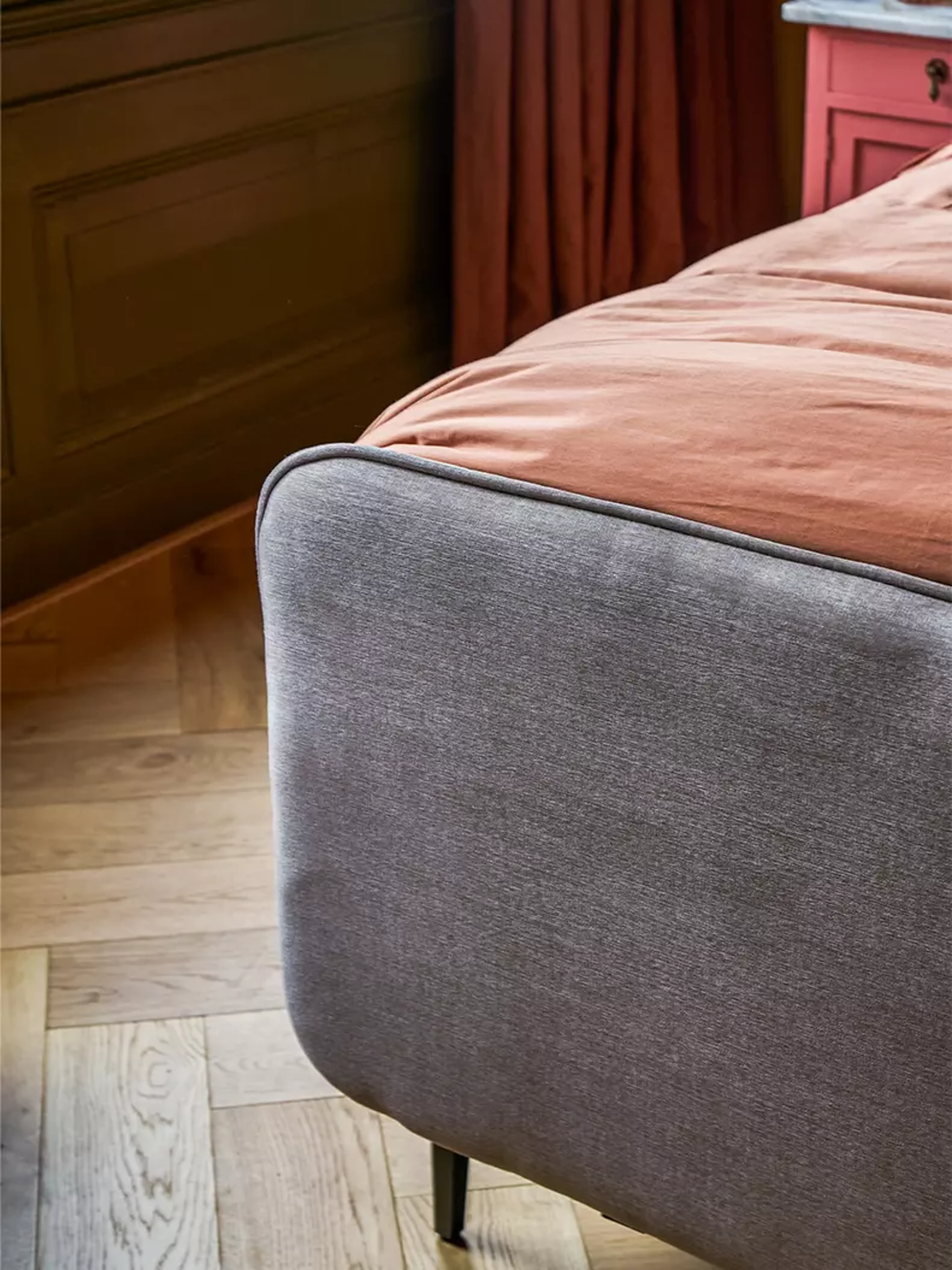 “Ons oude bed lag helemaal niet lekker meer dus het was de hoogste tijd voor een nieuwe. Ik wilde heel graag een boxspring op pootjes. De ronde hoeken van het hoofd- en voetbord van Boxspring Lifestyle by vtwonen Pepper spraken me direct aan. Omdat ons bed midden in de slaapkamer staat en je het ook ziet vanuit de woonkamer en eetkamer, heb ik gekozen voor een voetbord om het einde van het bed af te sluiten. Ik koos de stof Noble in de kleur Liver omdat deze echt overal bij past en ik nogal eens verander van styling in de slaapkamer.”