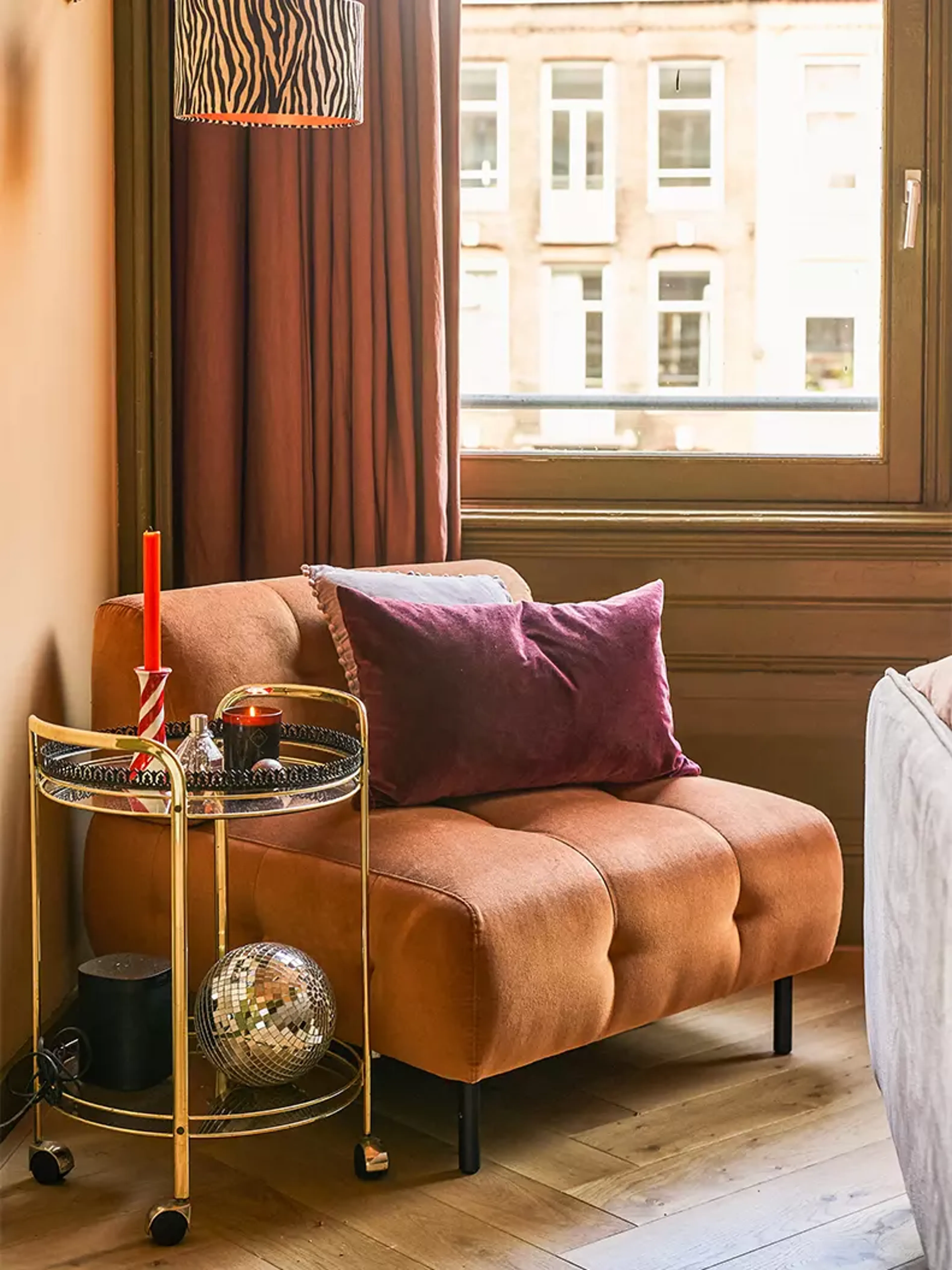 Doortje haar startpunt bij het inrichten van de slaapkamer was het maken van een moodboard. “Ik haal veel inspiratie uit de horeca, omdat ik een warme en gezellige sfeer wilde creëren. Daarna heb ik het moodboard aangevuld met kleuren en materialen. Door alles vooraf bij elkaar te leggen, weet je zeker dat het altijd goed zal staan. De slaapkamer is vrij groot en ligt op het noorden, waar de lichtinval van nature killer is. Door met warme kleuren te werken maak je het zachter en knusser. Het moest een plek worden om echt tot rust te komen, lekker te slapen en goed te kunnen ontspannen.”