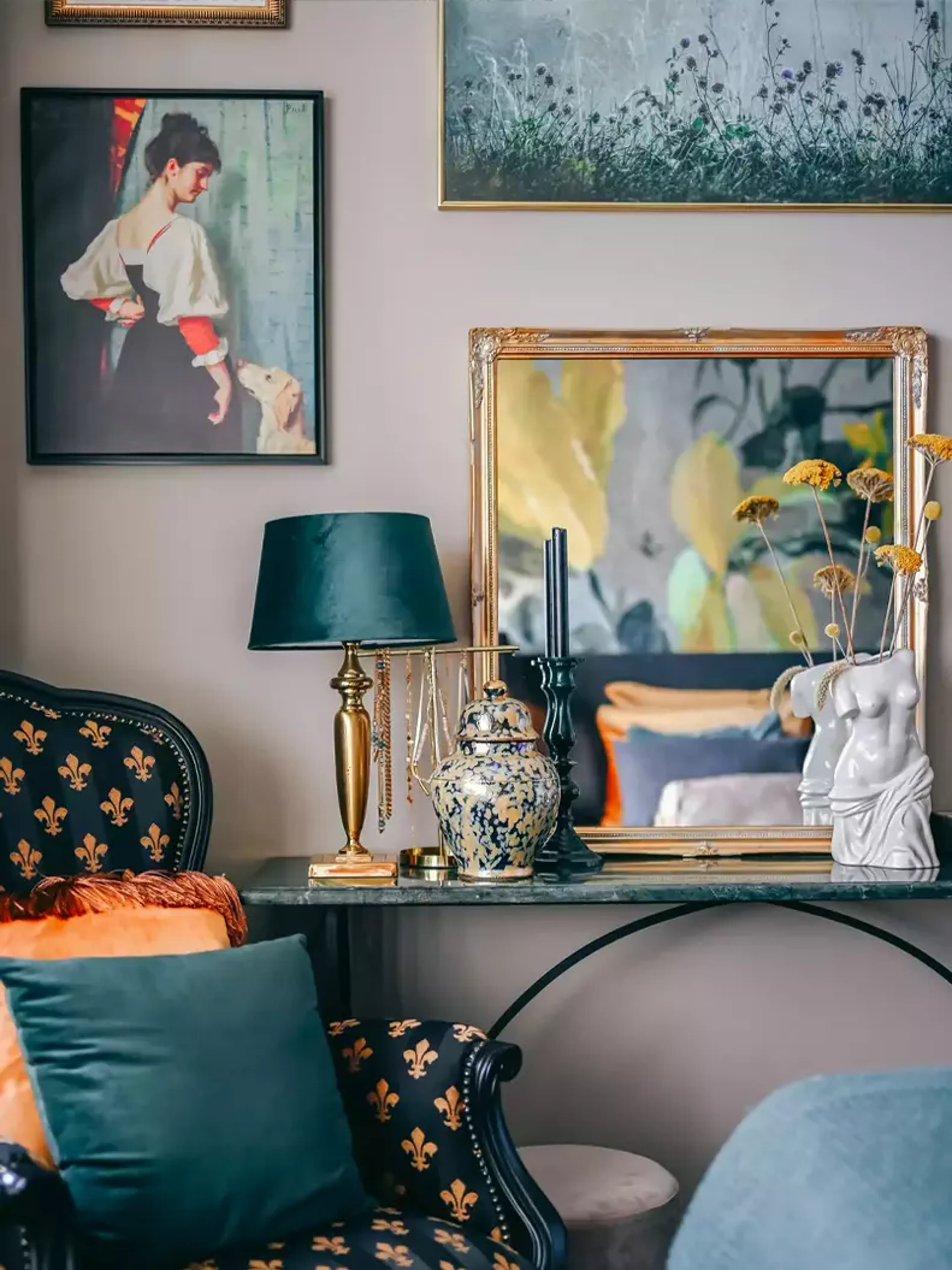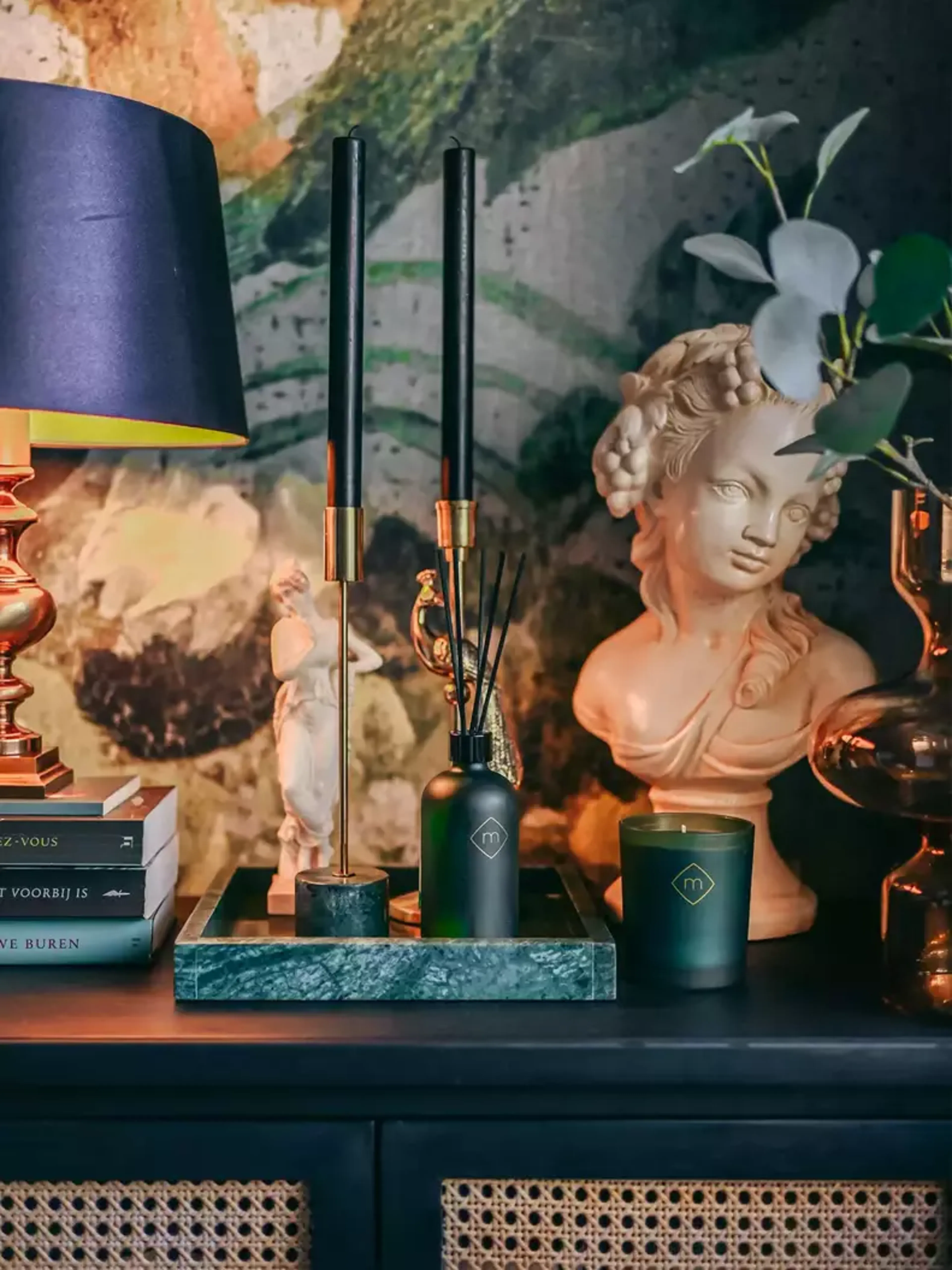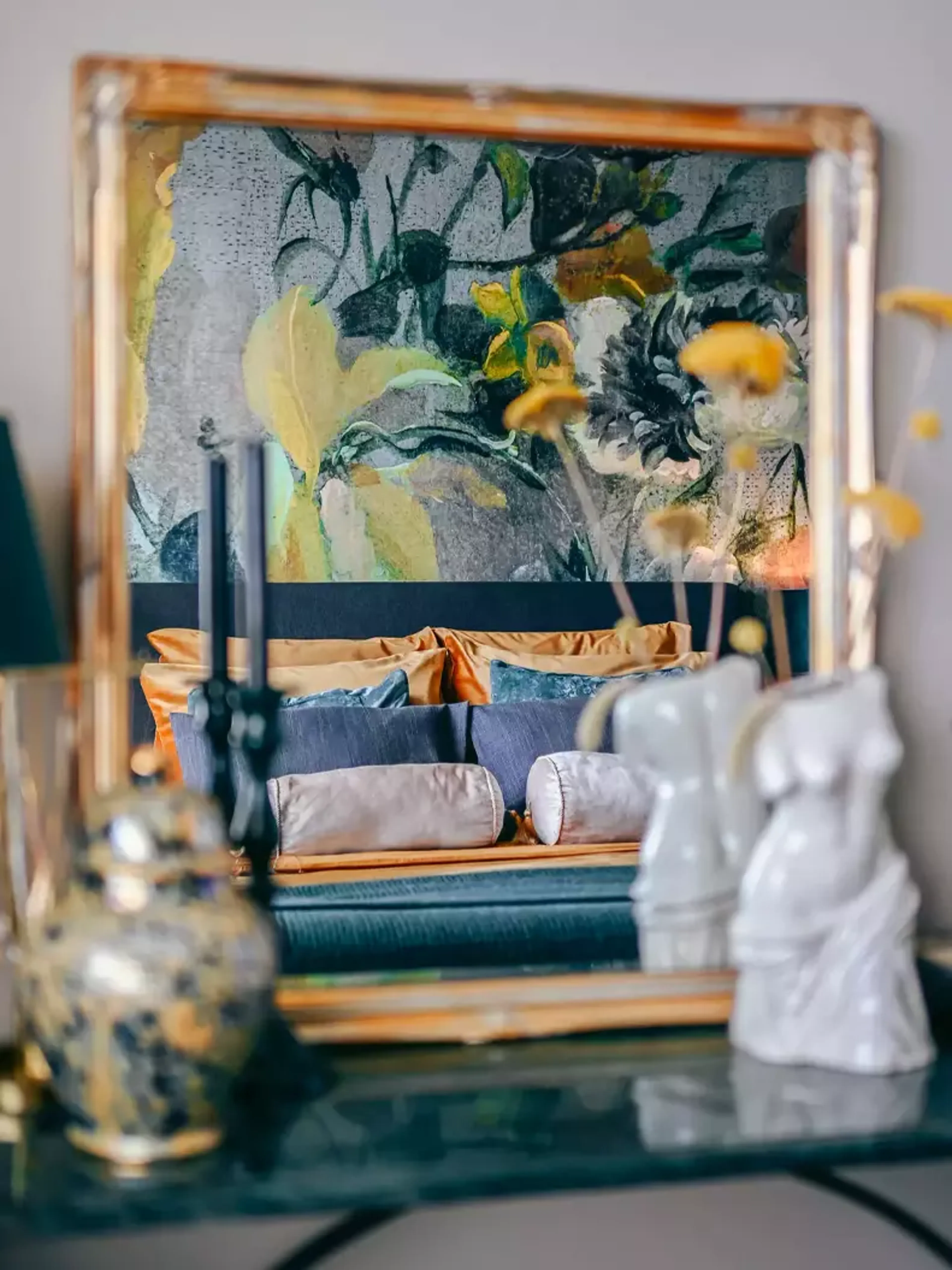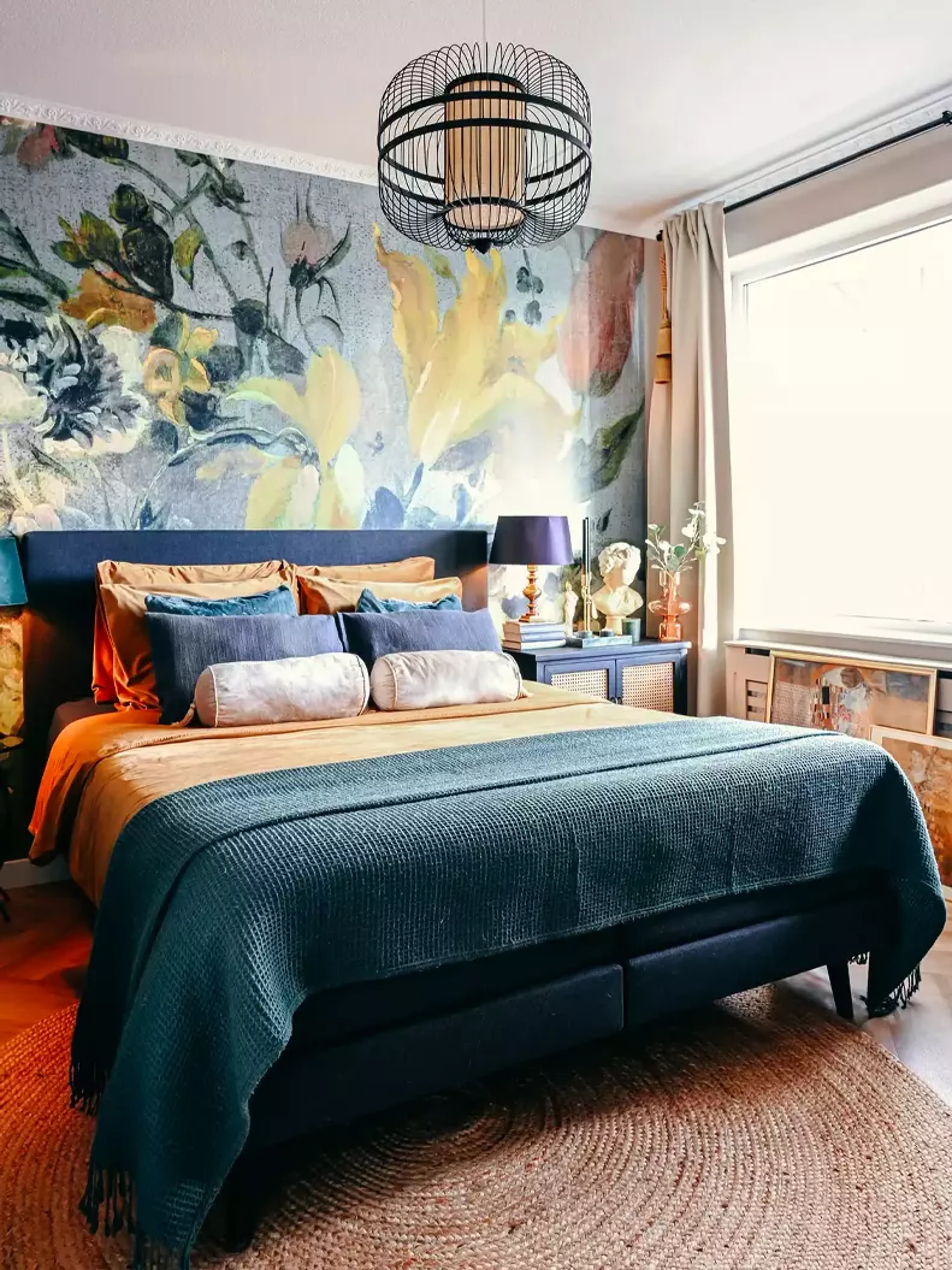 Wanneer je de slaapkamer binnenkomt, springt het rijke behang met bloemmotief met daarvoor het strakke, donkere bed direct in het oog. De warme, donkere kleuren van groen en okergeel gecombineerd met rijke materialen zoals het velours beddengoed en marmer geven de ruimte direct een luxe en geborgen gevoel. “Ik vind het leuk als mijn interieur anders is dan dat van anderen en houd van zachte materialen met harde kleurcontrasten.” De antieke accessoires en kringloopvondsten zorgen voor een stijlvolle, maar bescheiden klassieke touch.