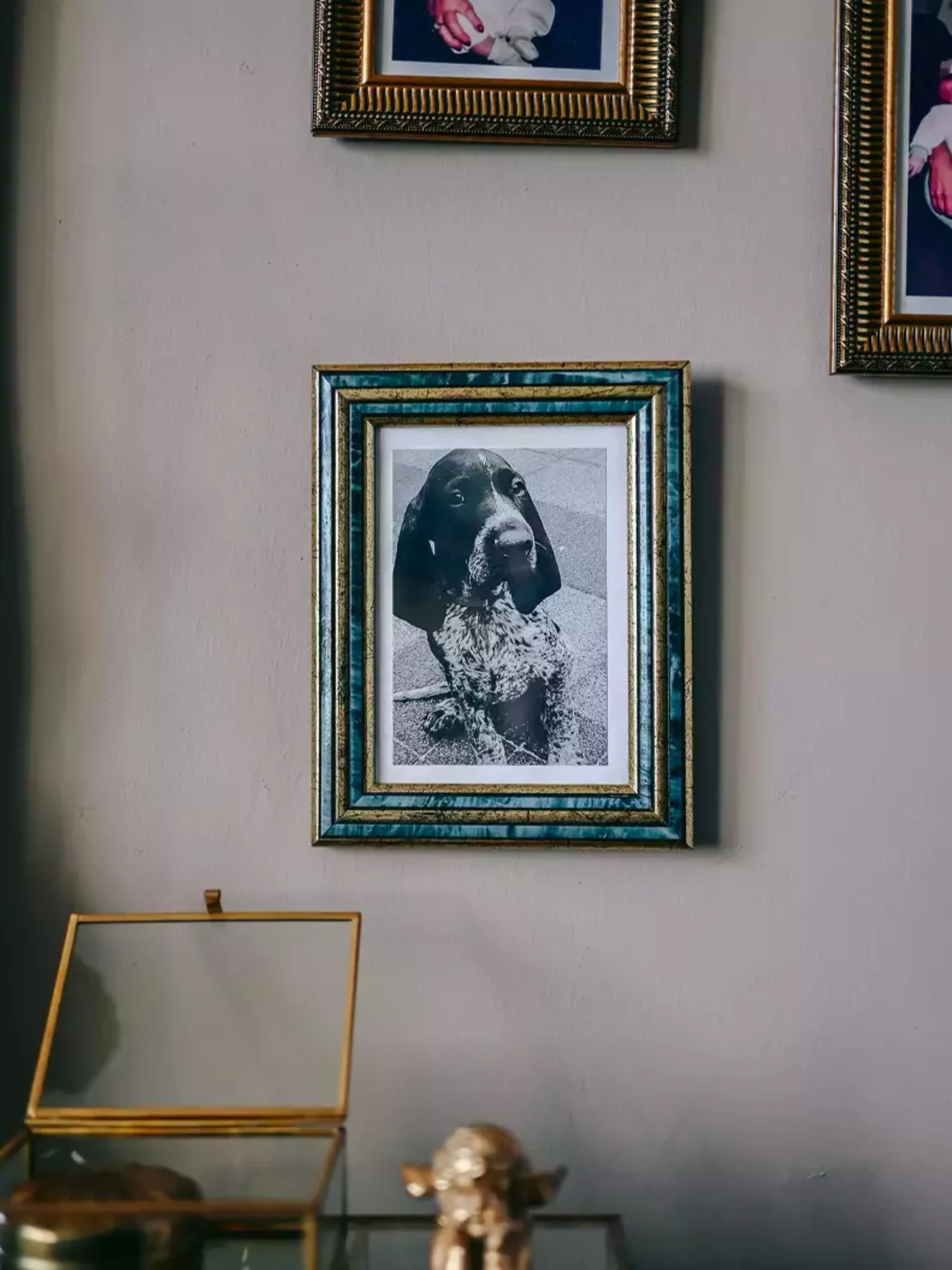 “Ik houd van een geborgen en warm interieur, zeker in de slaapkamer. En daar horen persoonlijke spullen bij.” Naast haar kringloopparels pronkt daarom aan de muur ook een foto van hond Bommel in zijn jongere jaren. Een waardig lid van het huishouden. Want hoewel het eigenlijk niet de bedoeling is dat Bommel in de slaapkamer slaapt, betrapt Katja hem daar wel eens op.