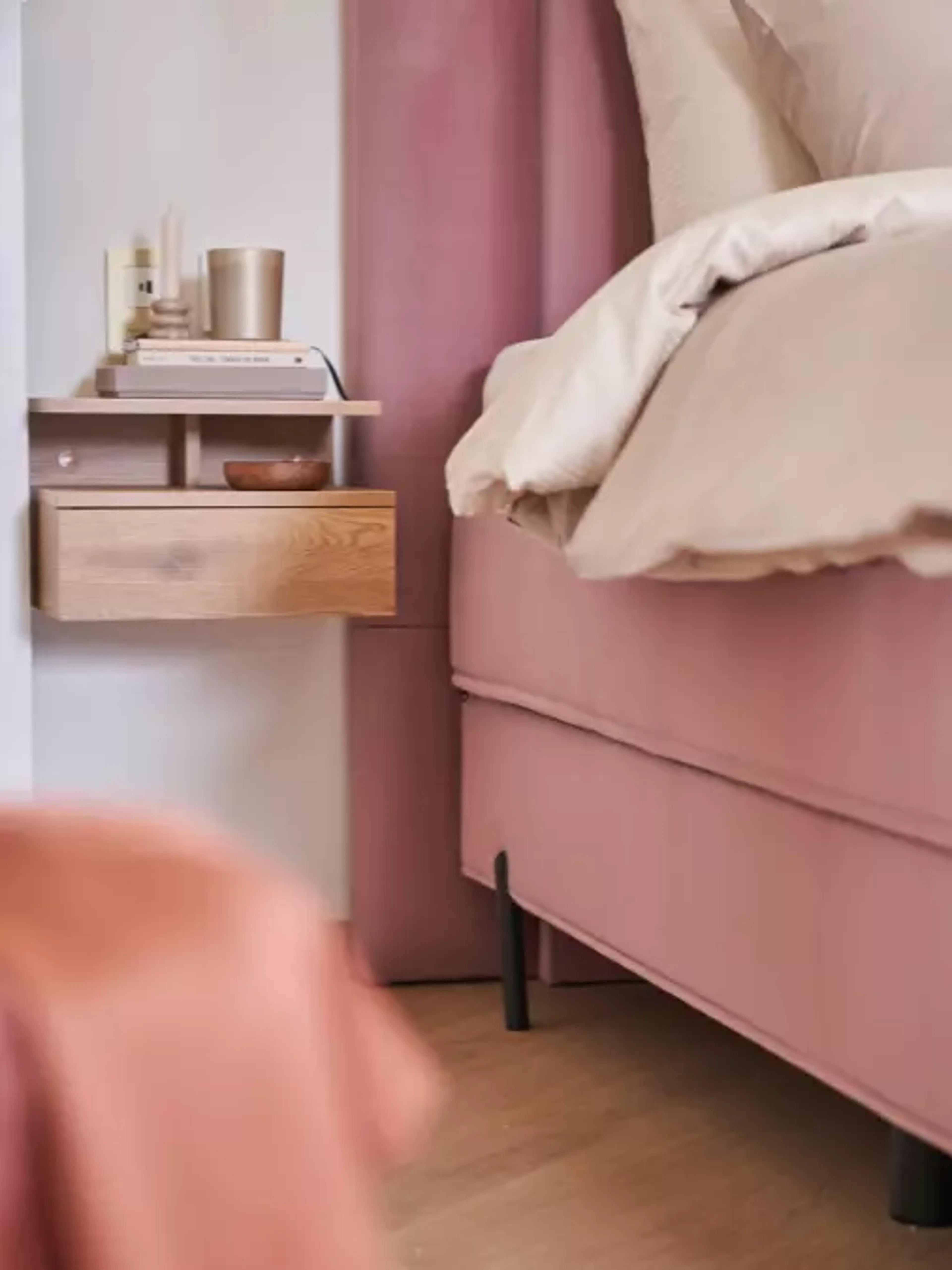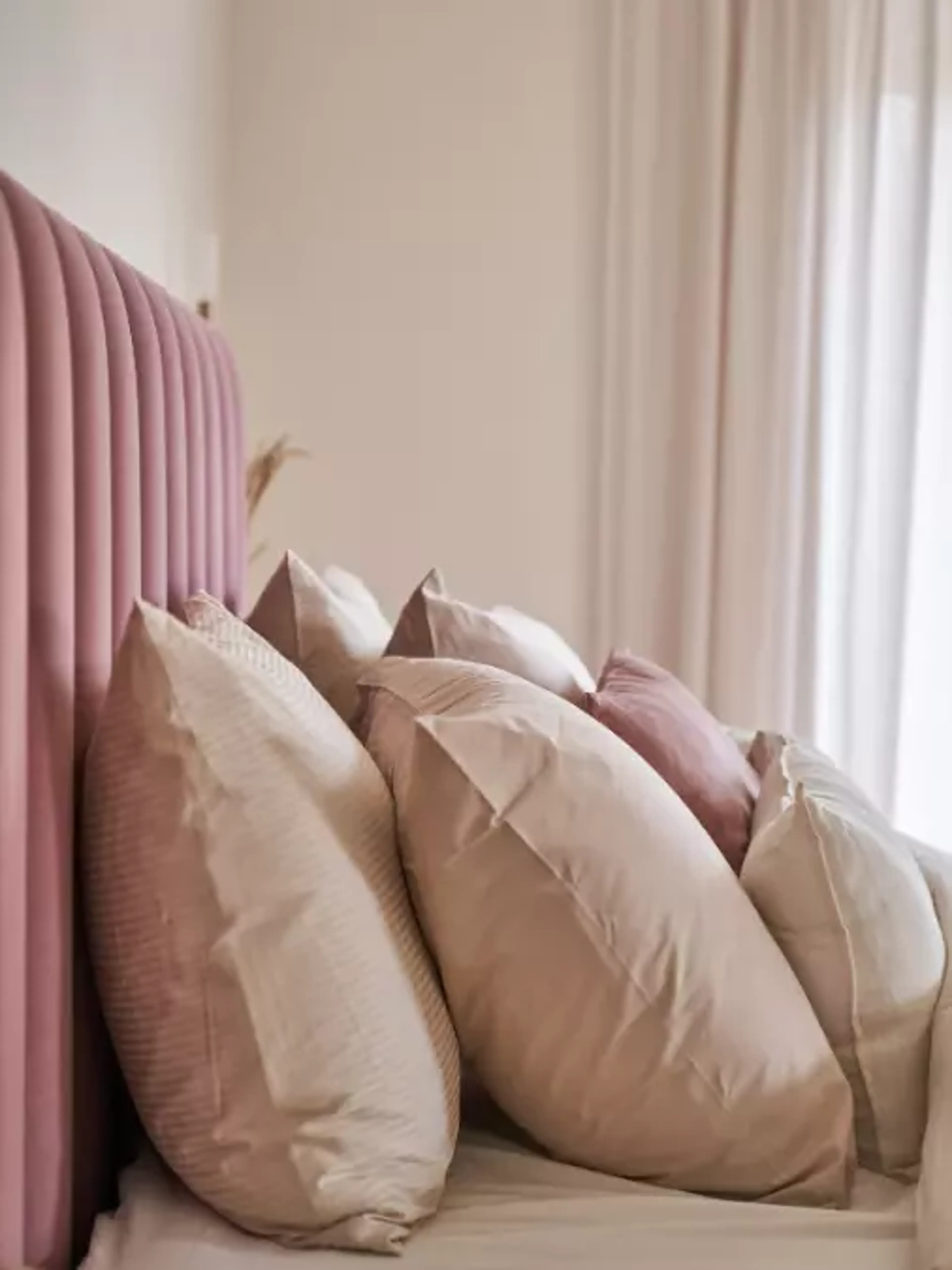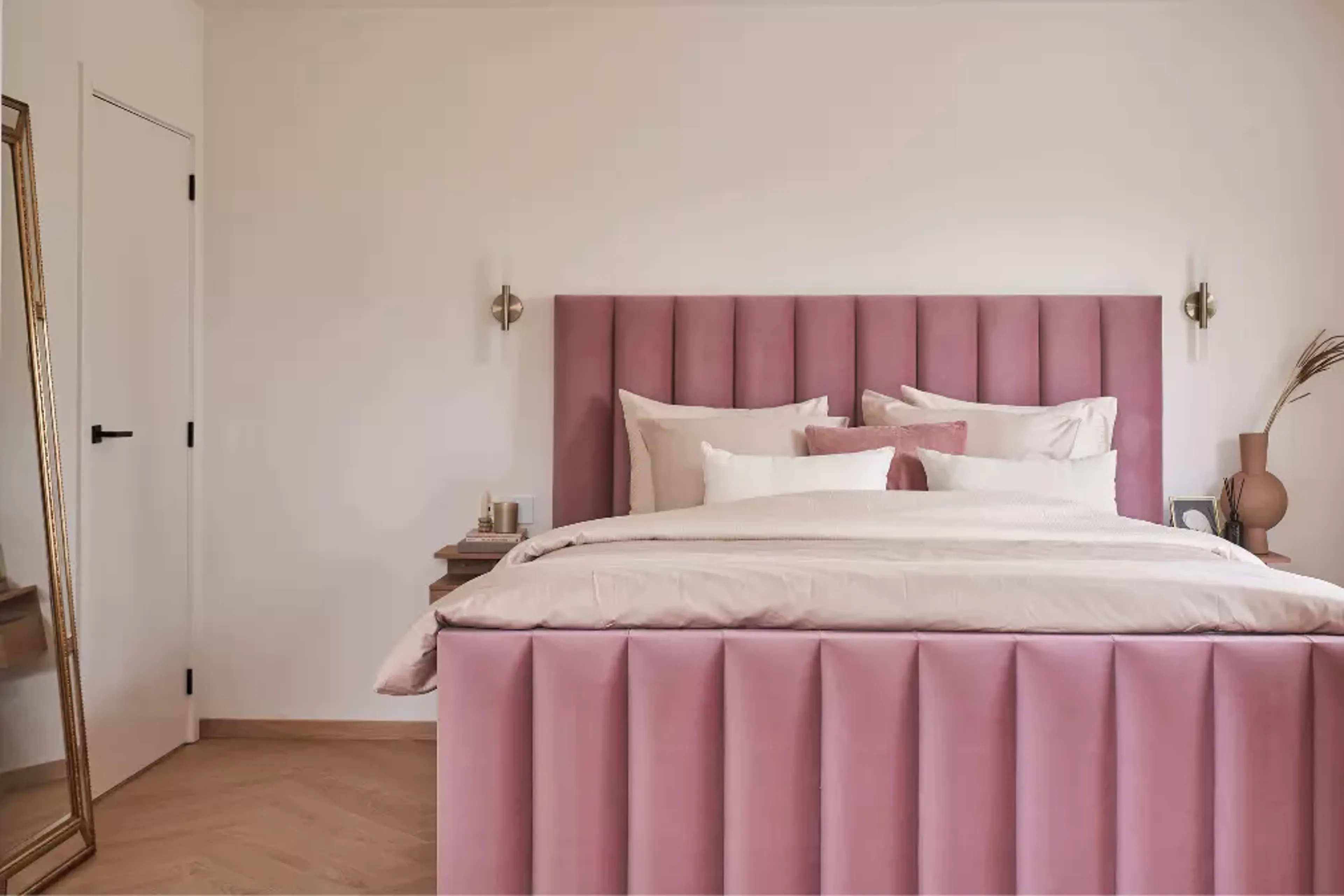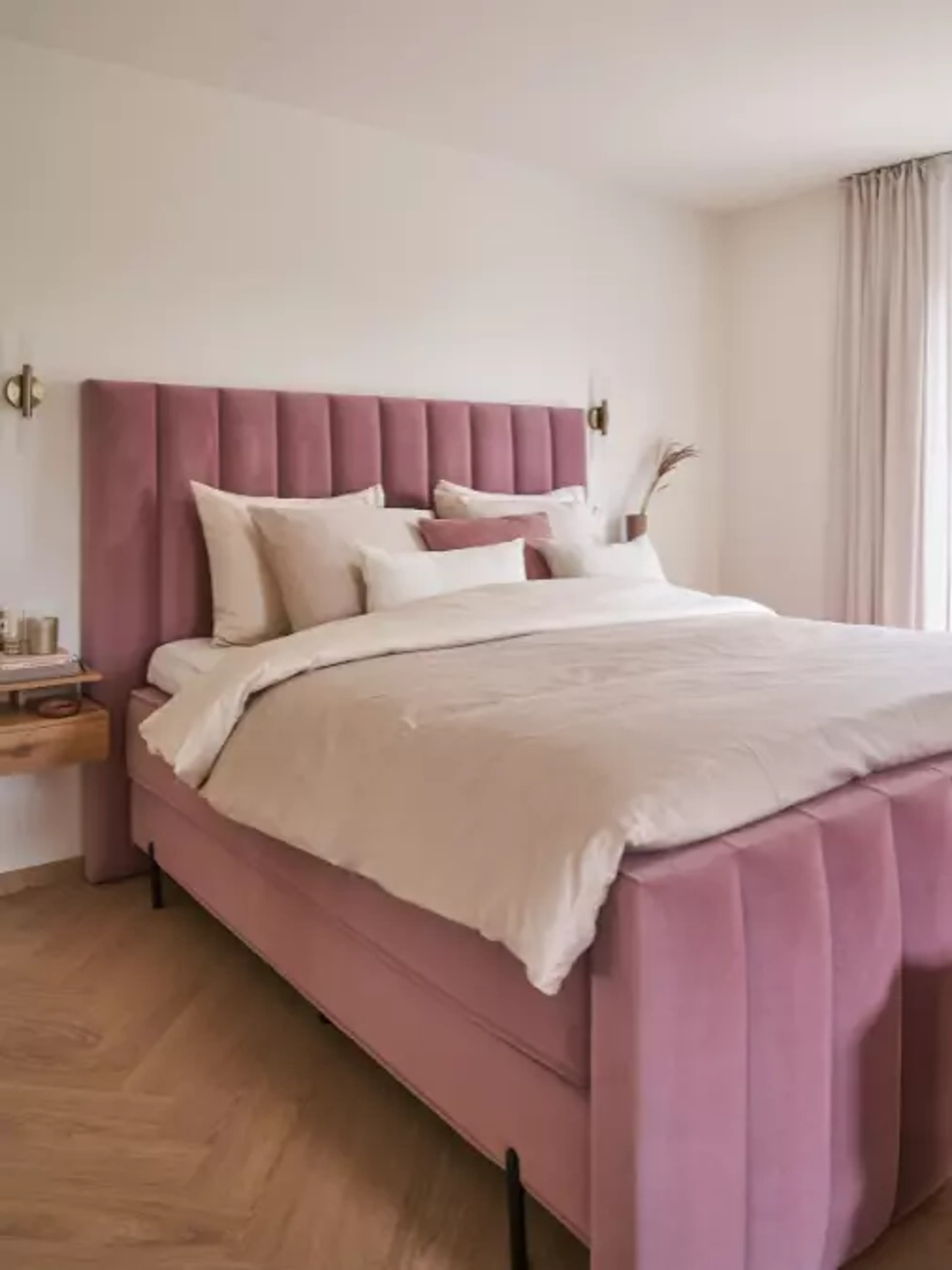 “Bij het inrichten van onze slaapkamer hield ik mijn favoriete hotelkamer in gedachten. Ik vind het fijn dat deze nu heel clean en rustig is met zo weinig mogelijk spullen. Toen we gingen verhuizen, besloten we dat het tijd was voor een nieuw en tijdloos bed. Functionaliteit is voor ons ook belangrijk. De stof is goed schoon te houden en door de hoge pootjes kunnen we er gemakkelijk onder stofzuigen. We twijfelden lang over een beige bed, maar uiteindelijk kwamen we tot de conclusie dat een neutrale beige teint toch niet helemaal bij ons past. Dus zijn we voor de bold choice gegaan. Sieg houdt niet van veel keuzes. Ik koos daarom 3 bedden waaruit hij kon kiezen en toen koos hij Boxspring Royal Metropolis in het roze. Nu is het écht een eyecatcher.”