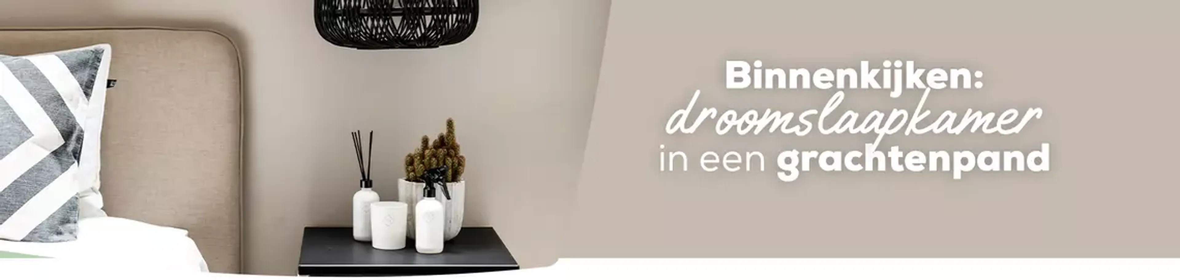 “Naast een heerlijk bed vind ik veel sierkussens en plaids onmisbaar. Die geven de ruimte die zachte, warme uitstraling die bij dat typische boetiekhotelgevoel horen. Het dekbedovertrek stop ik niet in, maar laat ik over het voeteinde van het bed hangen voor een nonchalante look. Op het nachtkastje staat een opbergpotje voor items die ik veel gebruik, maar niet wil laten rondslingeren zoals oordopjes en mijn horloge. En natuurlijk mag in een boetiekhotel een aangename geur niet ontbreken. En extra leuk: die geurstokjes of geurkaars zorgen niet alleen een prettige sfeer, maar staan ook nog eens mooi op je nachtkastje.”