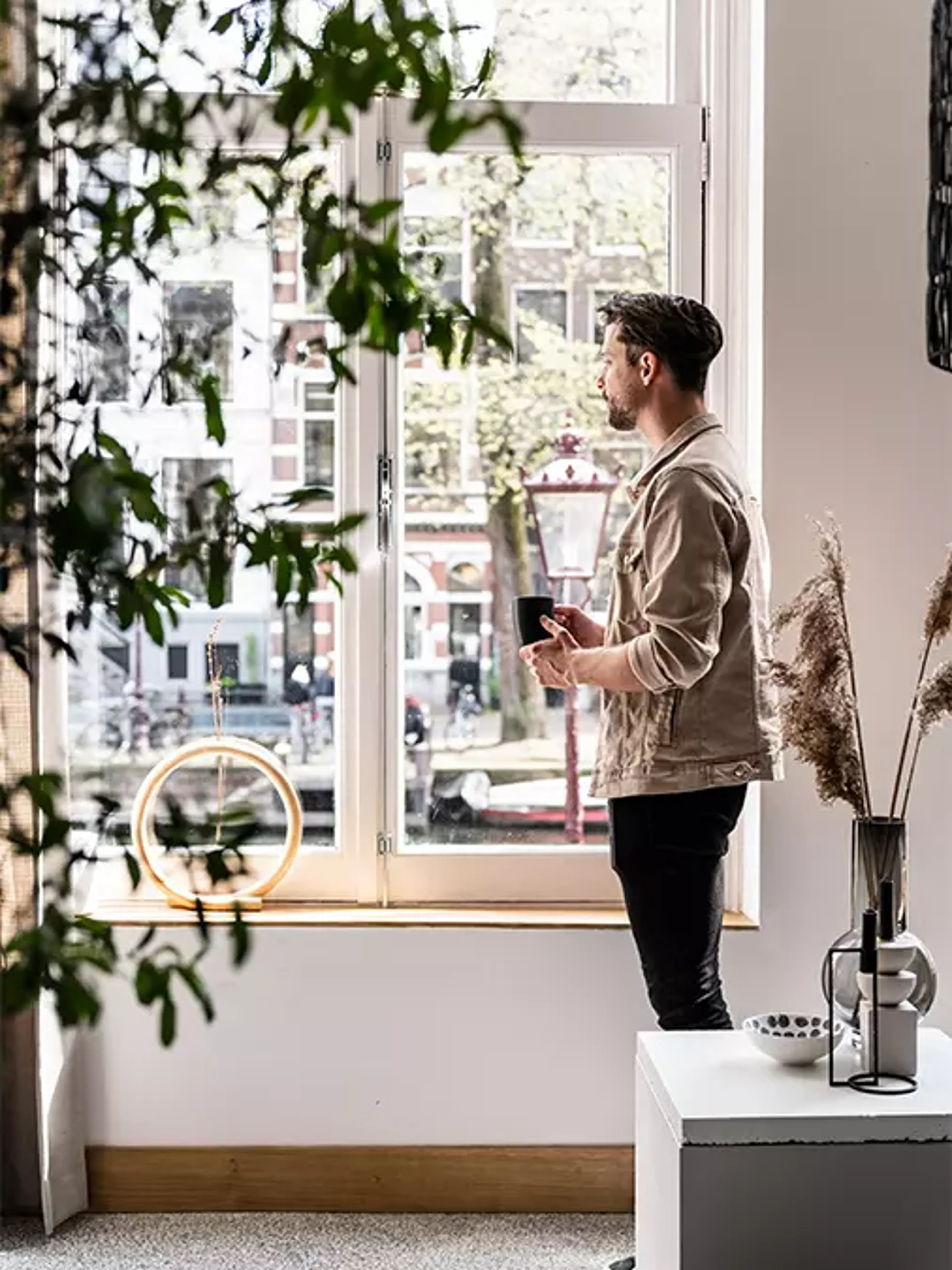 De interieurstijl van Klaas is door de jaren heen behoorlijk veranderd. Hij is van een Bohemian look naar een meer minimalistische en grafische stijl gegaan. “Mijn nieuwe huis in Amsterdam had deze aanpassing ook nodig aangezien het een heel ander pand is dan mijn herenhuis in Den Bosch. Ik zou mijn interieur stijl omschrijven als Urban Boho. Een mix van verschillende stijlen met als basis rustige natuurlijke kleuren en gebruik van materialen als hout, linnen, staal en marmer.”