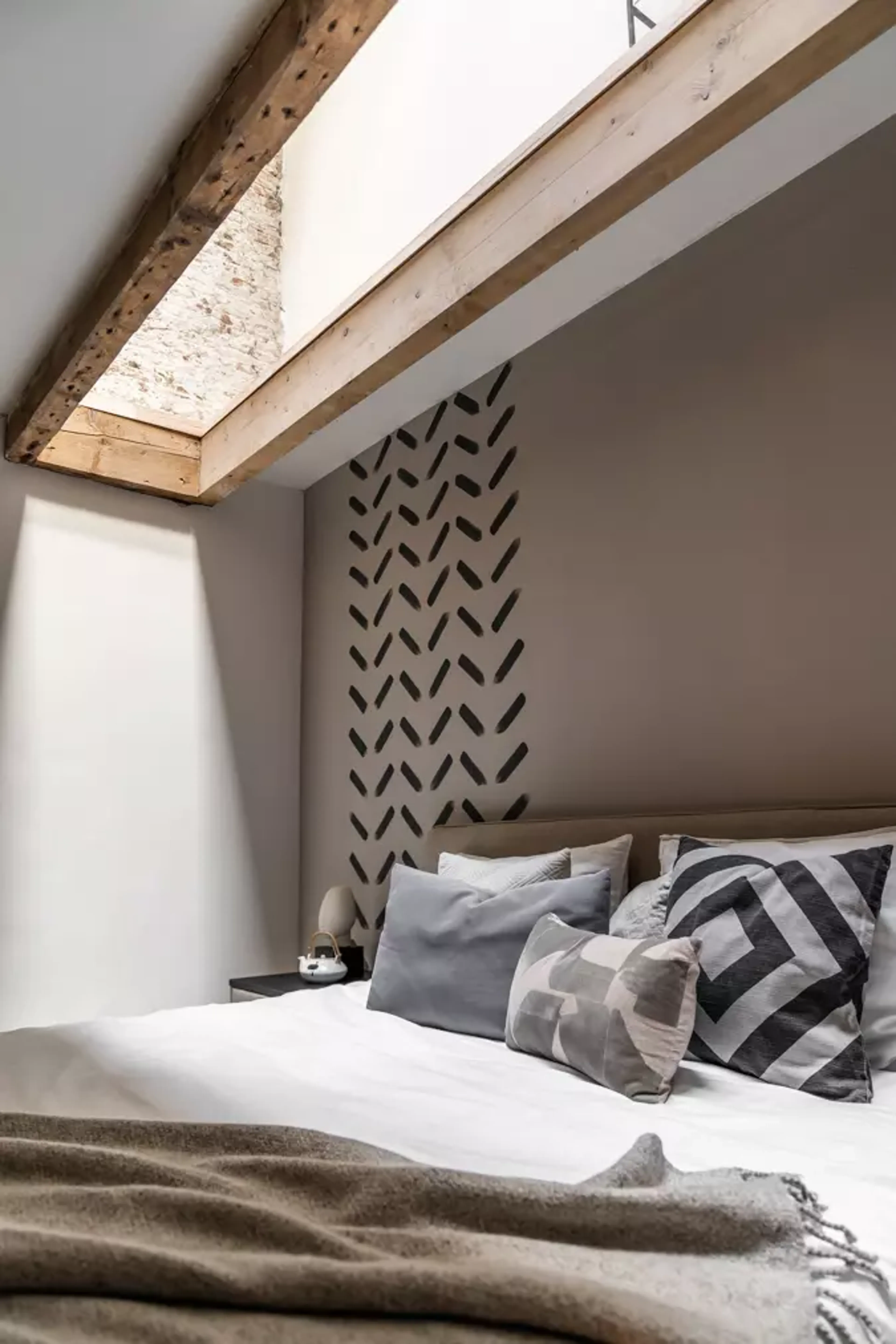 “Ik houd van contrast in materiaalgebruik. Dat maakt een ruimte interessant en sfeervol. Glad met grof, open met gesloten structuren, oud en nieuw. Als je daar op let ontstaat er snel een sfeervol geheel. Het oude balkenplafond en de warme, zachte stof van het bed, vormen nu een mooi contrast met de ruwe betonnen vloer, het staal van de bedpootjes en de afdekplaat van het nachtkastje. De muur achter het bed wilde ik in eerste instantie voorzien van behang, maar dat werd te druk. Ik kwam per toeval dit streepjespatroon tegen dat ik zelf op de muur heb geschilderd. Door het patroon slechts aan een kant van het bed toe te passen, ontstaat er een speels effect en blijft de ruimte toch rustig.”