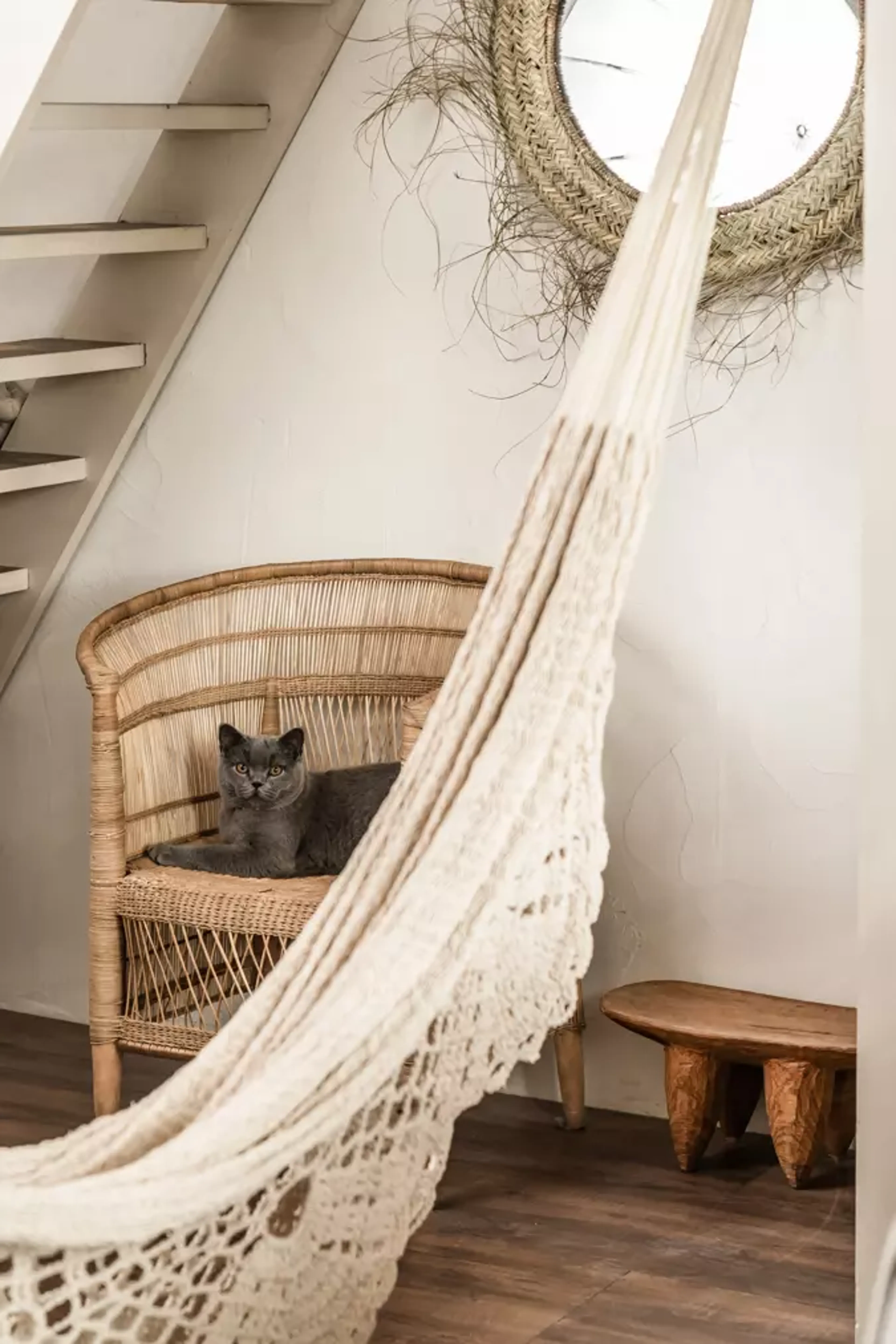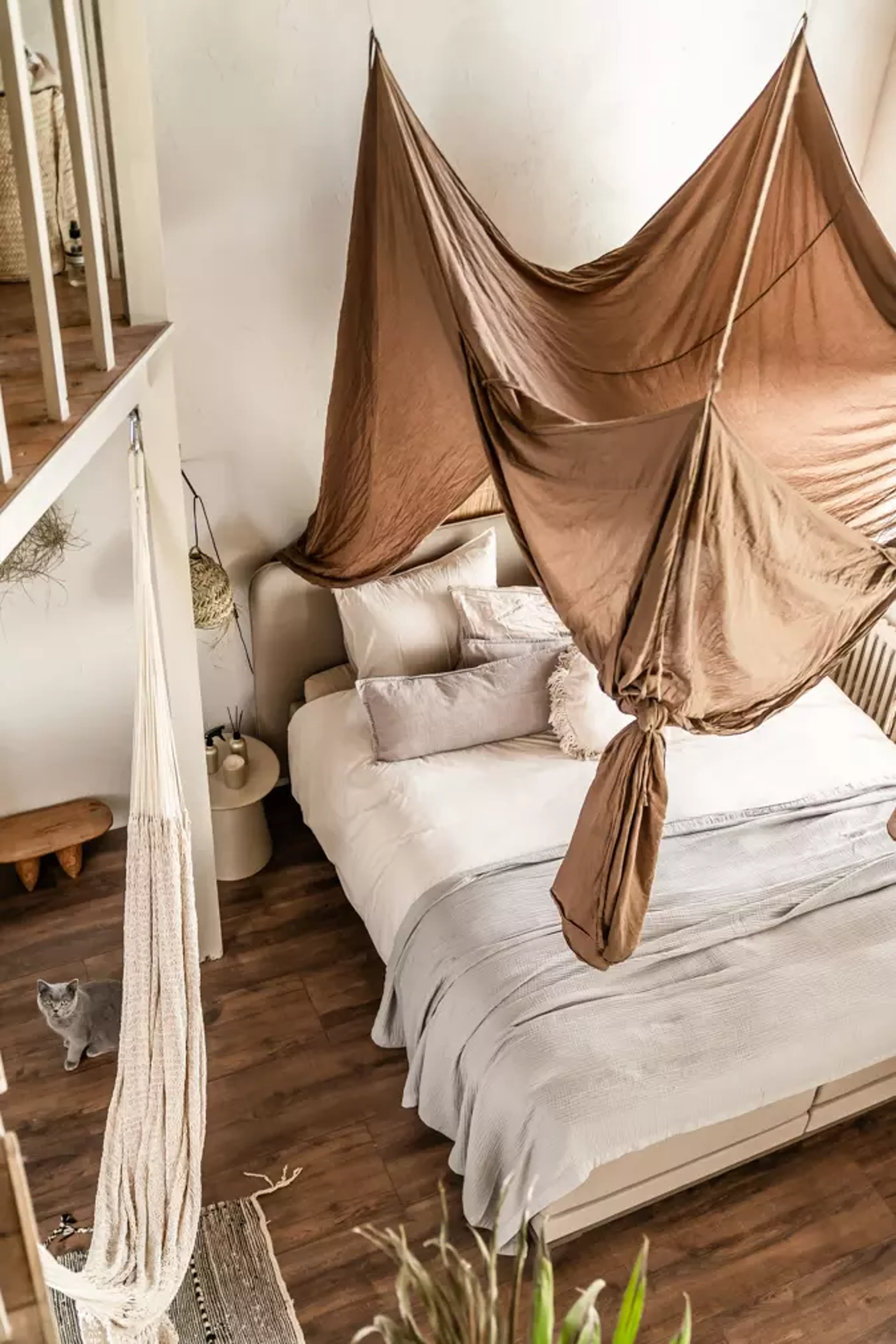 "Met twee kinderen kan ik echt enorm van mijn slaap genieten. Een royaal bed is dan ook onmisbaar in de slaapkamer. Ik koos voor boxspring Lifestyle by vtwonen Pepper in een zachte, neutrale kleur (Nature 101 Beige), zodat het goed bij mijn stijl en de rest van de ruimte past. Om het bed echt in de schijnwerpers te zetten heb ik een hemel boven het bed gehangen. Juist door de hoge ruimte geeft dit geborgenheid en een fijne, gezellige sfeer en nodigt het bed nog meer uit. De hangmat, het bad én een fijne geur maken het vakantiegevoel compleet."