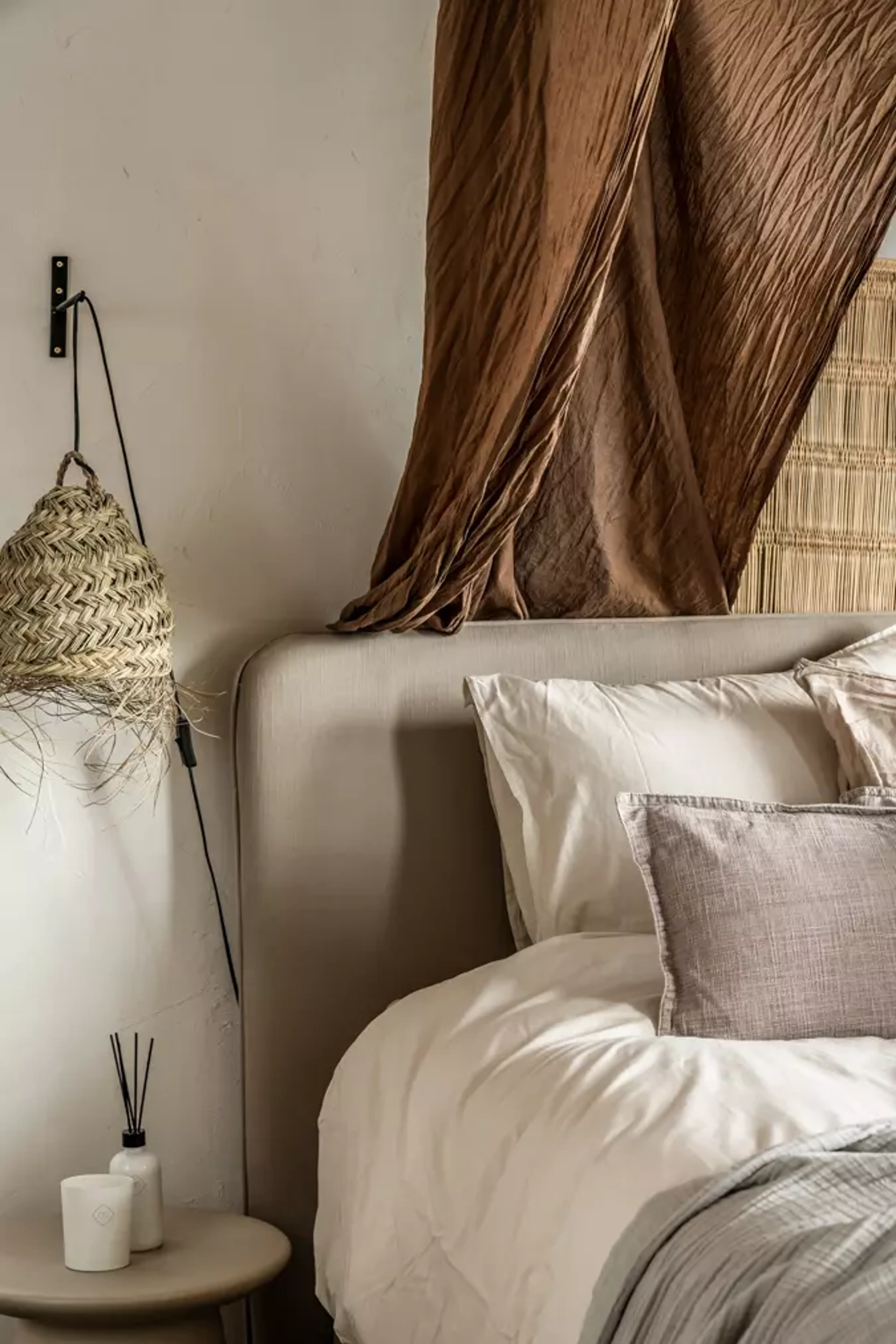 “Ik vind het mixen van materialen en structuren in een interieur erg fijn. Dat maakt het spannend. De muur achter ons bed is daarom niet gestuukt en geverfd. Dit vormt een mooi contrast met de natuurlijke, linnenachtige stof van het bed en de zachte, afgeronde hoeken van het hoofdbord. Ook op het bed zie je een mix van materialen. Zo heb ik fijne, linnenachtige sierkussens gecombineerd met beddengoed van katoen en een fijner geweven plaid. Die combinaties maken het geheel wat speelser. Het houten tafeltje, de palm en het lampje van zeegras maken het voor mij helemaal af."