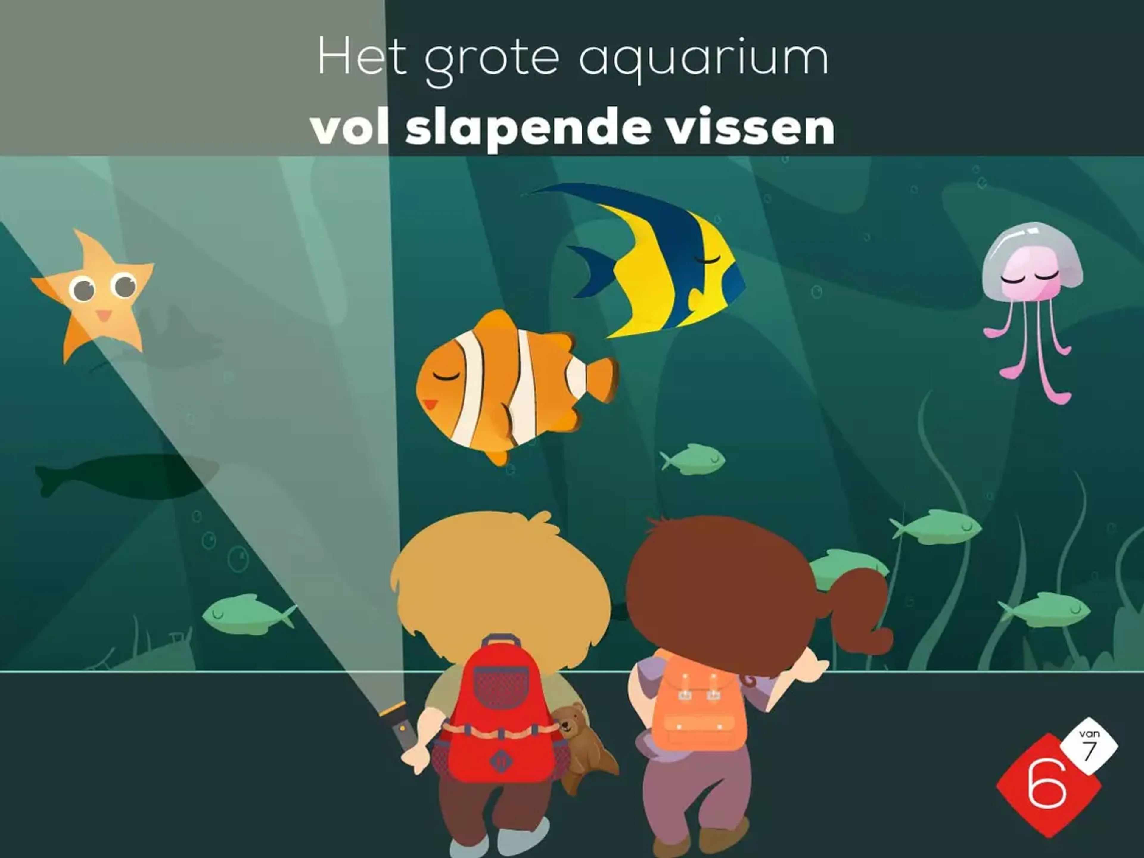 Pim en Roos zijn bijna bij het grote aquarium aangekomen. Ze zijn natuurlijk erg benieuwd hoe alle vissen slapen. Overdag zie je in het aquarium overal waar je kijkt vissen zwemmen. Van klein tot groot. Je ziet Nemo uit de film `Finding Nemo`, maar ook grote en gevaarlijke haaien. Zouden alle vissen nu dan op de grond liggen met hun ogen dicht?