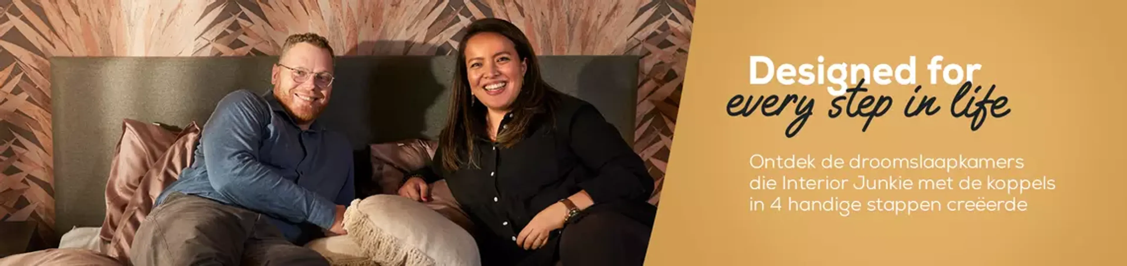 Samantha en Alex zijn in verwachting van hun eerste kindje en daardoor schoven de plannen voor de babykamer die van hun eigen slaapkamer op. In vier handige stappen maakte Interior Junkie samen met het koppel van de ongezellige slaapkamer een Luxe Coconnetje vol sfeer. Met poedertinten, donker hout, messing, zachte materialen en boxspring Lifestyle by vtwonen Thyme in Tweed Middle Grey is de look helemaal compleet!