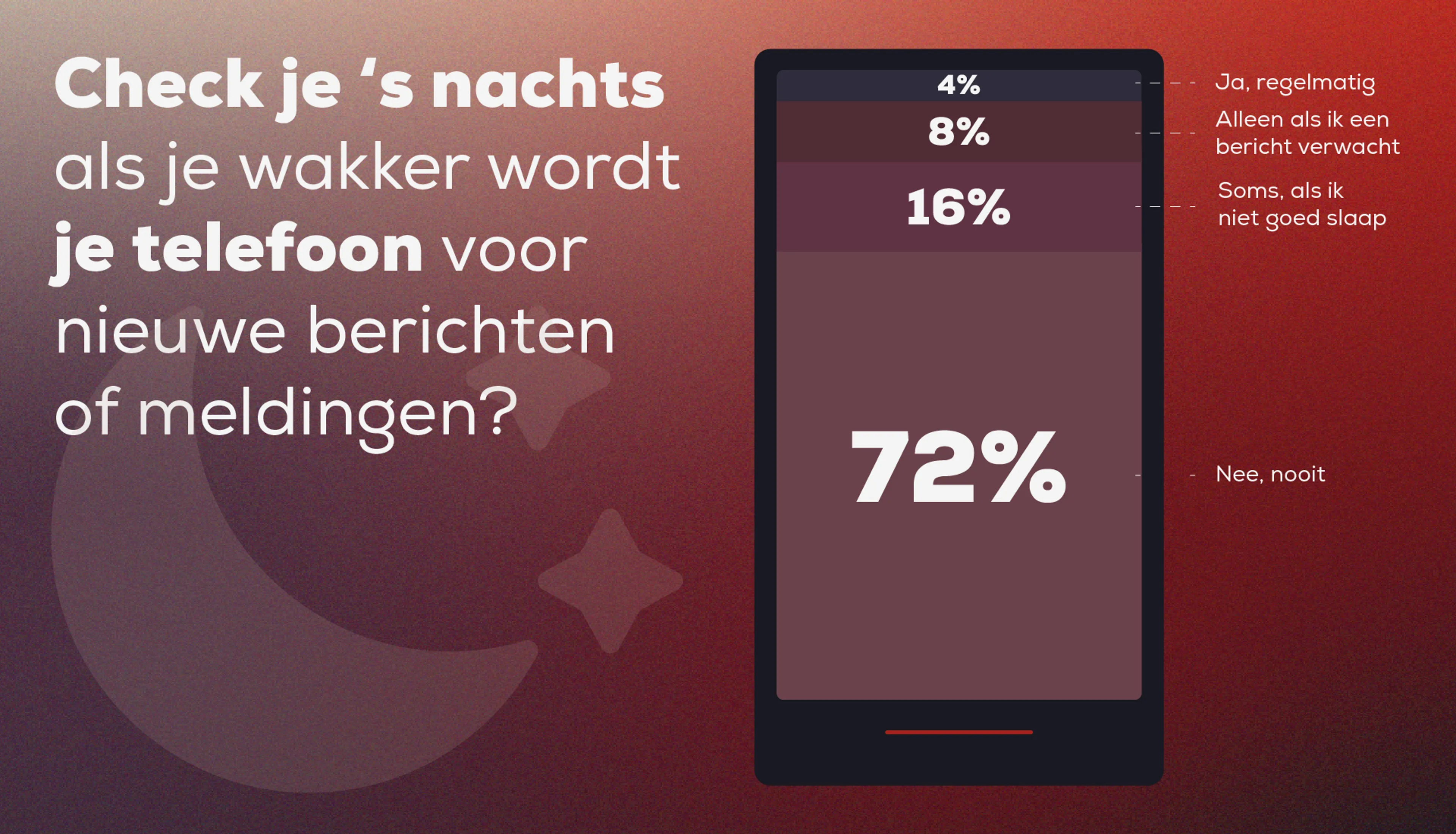 Toch blijft een klein deel zelfs ’s nachts met hun telefoon bezig: 4% kijkt regelmatig of er nieuwe meldingen zijn binnengekomen. Dat laat zien hoe sterk die gewoonte kan zijn, zelfs tijdens onze slaapuren. Wij hebben de rest van de reacties hieronder visueel in beeld gebracht.