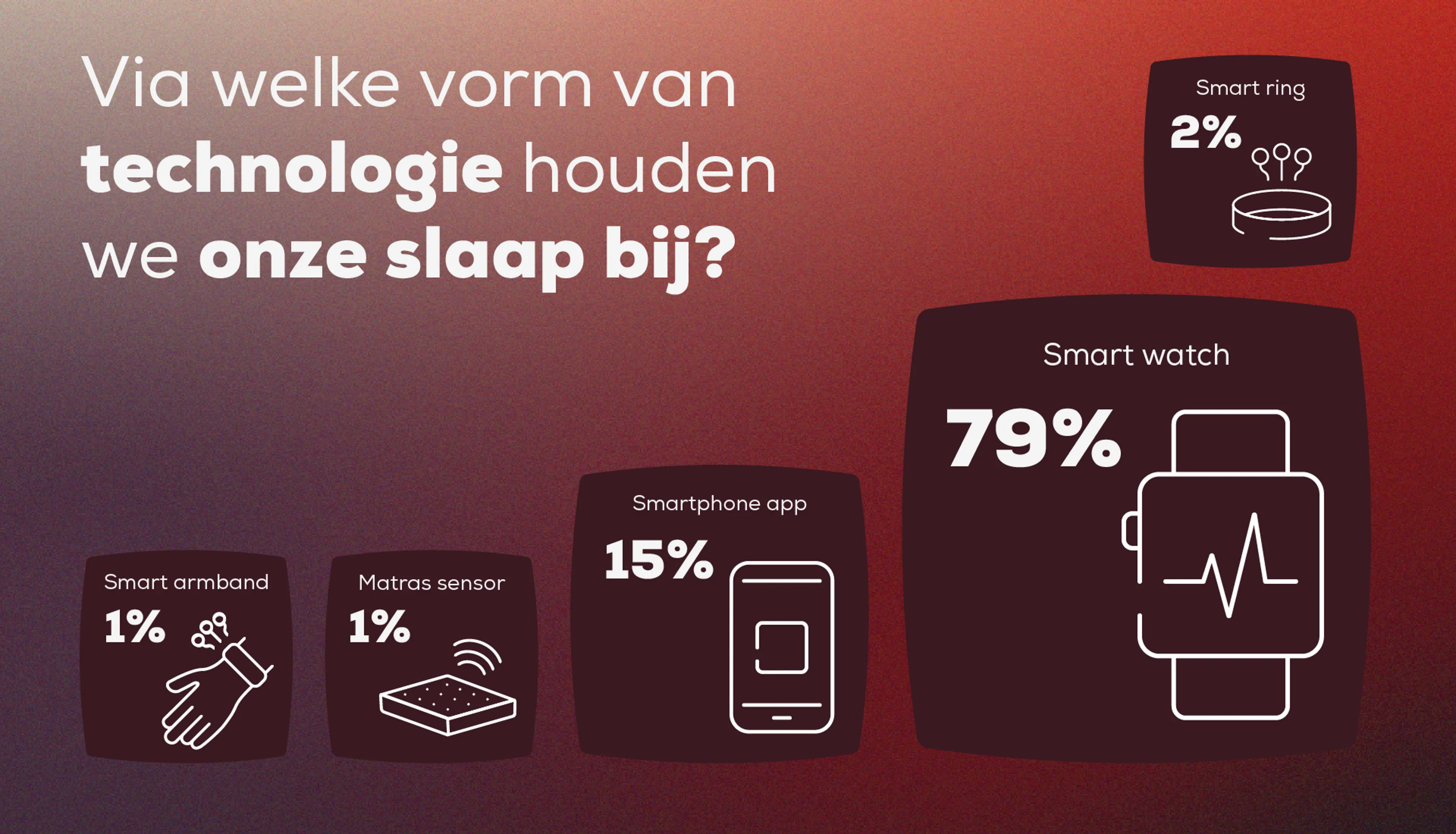 De meerderheid kiest voor een smartwatch als hulpmiddel; 79% gebruikt dit apparaat om inzicht te krijgen in hun slaapritme en kwaliteit. In de visual hieronder is te zien welke andere technologieën Nederlanders inzetten om hun nachtrust te monitoren.