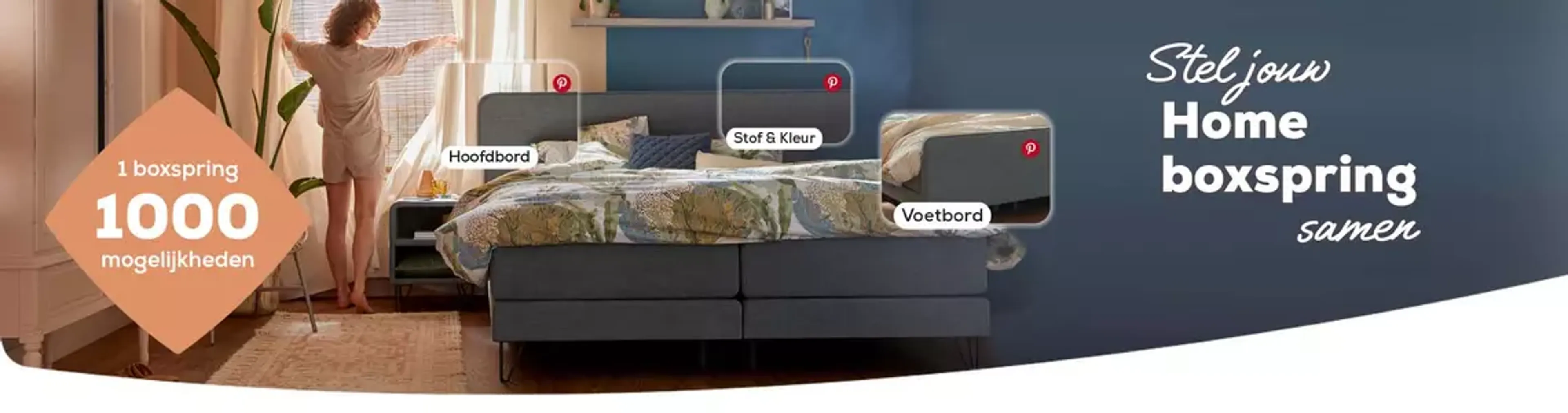 Voelt jouw slaapkamer nog als thuiskomen? Om ’s nachts te ontspannen en op te laden voor een nieuwe dag, is een goed bed essentieel. Daarom stel je de favoriete Home boxsprings van onze klanten nu helemaal naar wens samen. Zo ben je er zeker van dat jouw nieuwe bed perfect past bij je wensen, behoeften én portemonnee. Eén boxspring, duizend mogelijkheden.