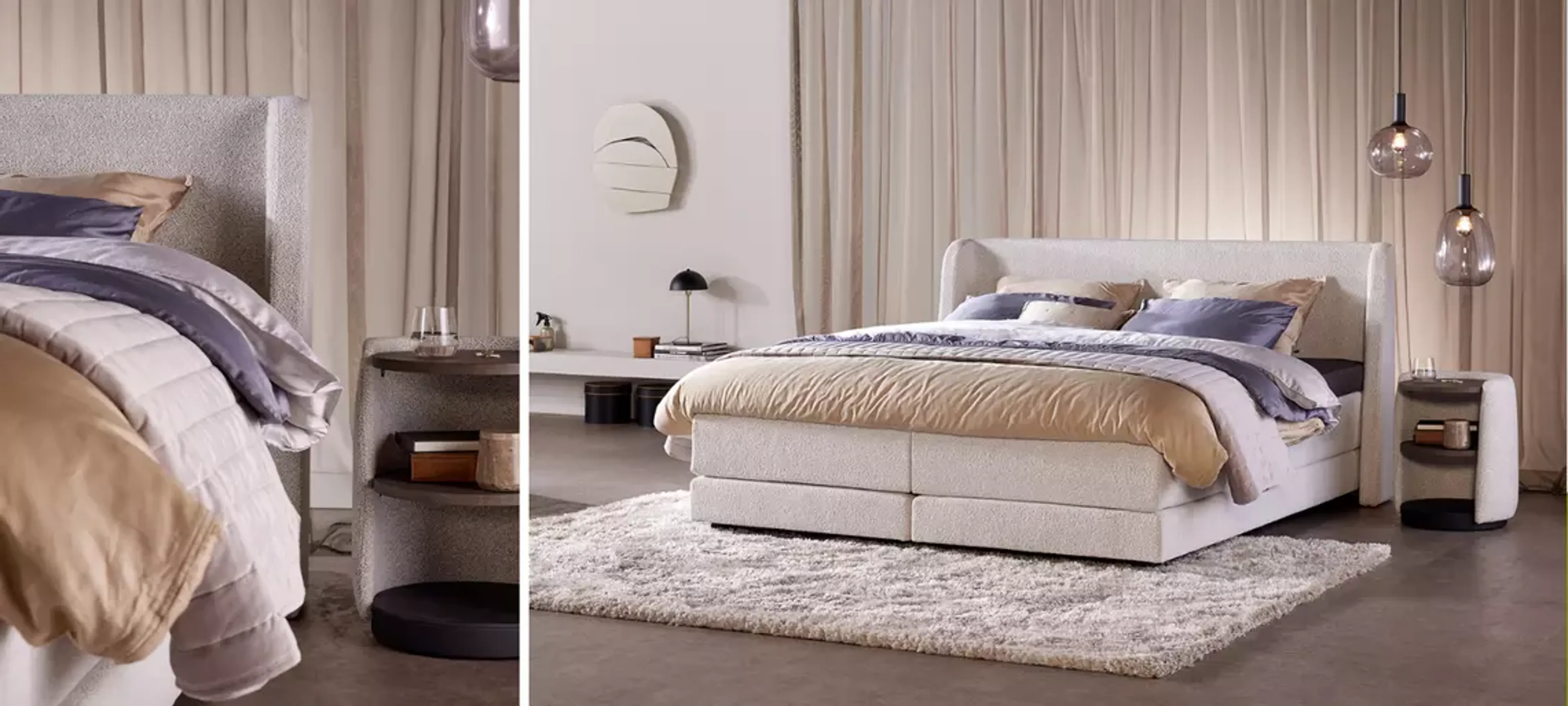 Wil jij een slaapkamer die voldoet aan de laatste trends? Laat je dan inspireren door deze trendy slaapkamer. Boxspring Night Milan is compleet gestoffeerd in bouclé stof en heeft ronde vormen, helemaal volgens de interieurtrends van dit moment. Door gebruik te maken van een trendy kleurenpalet zoals grijs- en beigetinten creëer je één geheel. Voeg tot slot katoen satijnen dekbedovertrekken met donkerhouten en gouden accessoires toe voor een luxe touch.